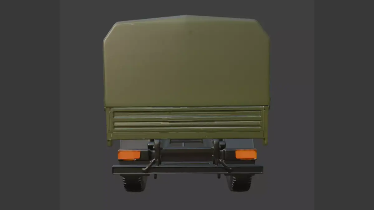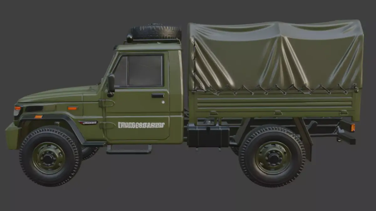 This 3D model features a rugged military truck in olive green, equipped with a canvas-covered cargo bed, roof-mounted spare tire, snorkel exhaust, and off-road tires. Ideal for tactical simulations, adventure animations, or defense-themed projects, it embodies durability and field-ready functionality.
