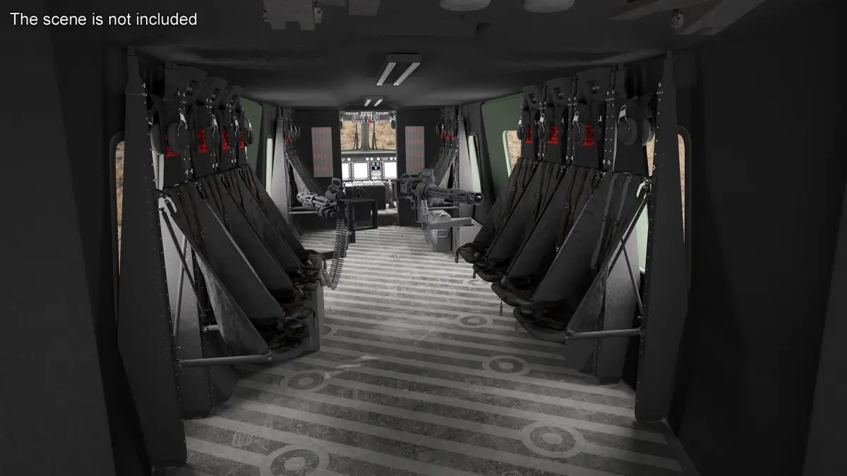 This model features a stealthy olive green exterior finish, optimized for camouflage in forest and nighttime missions. The detailed interior includes modeled pilot and co-pilot seats, troop transport benching, and operational accessories. The geometry incorporates accurate rotor mechanisms, functional doors, and landing gear, offering versatility for both static and animated presentations.