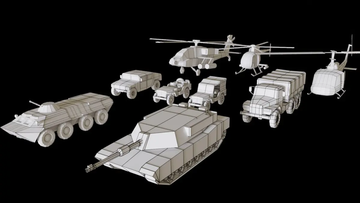 Pack contains:-Humvee-Willys Jeep-Ural 375-Btr-80-M1 Abrams-AH-64 Apache helicopter-Little Bird helicopter-UH-1 Huey helicopter
