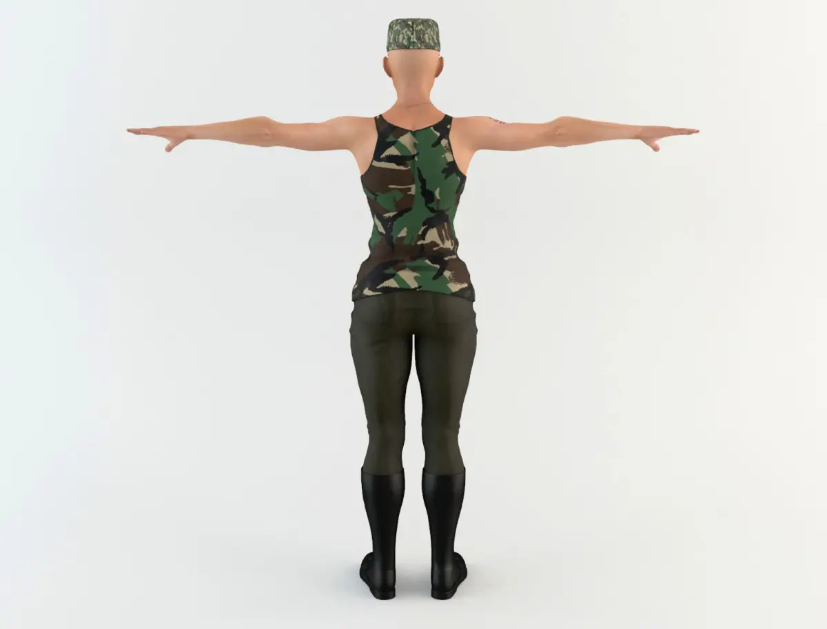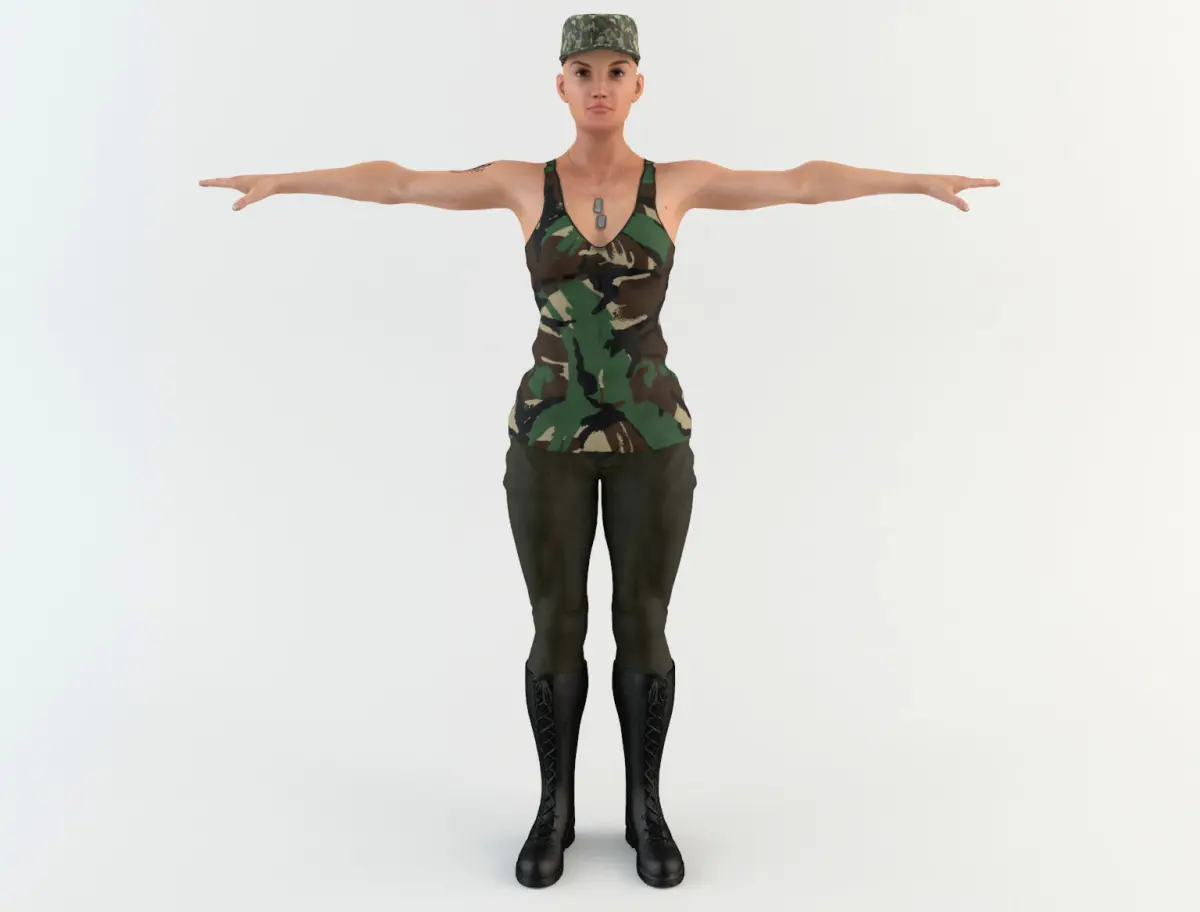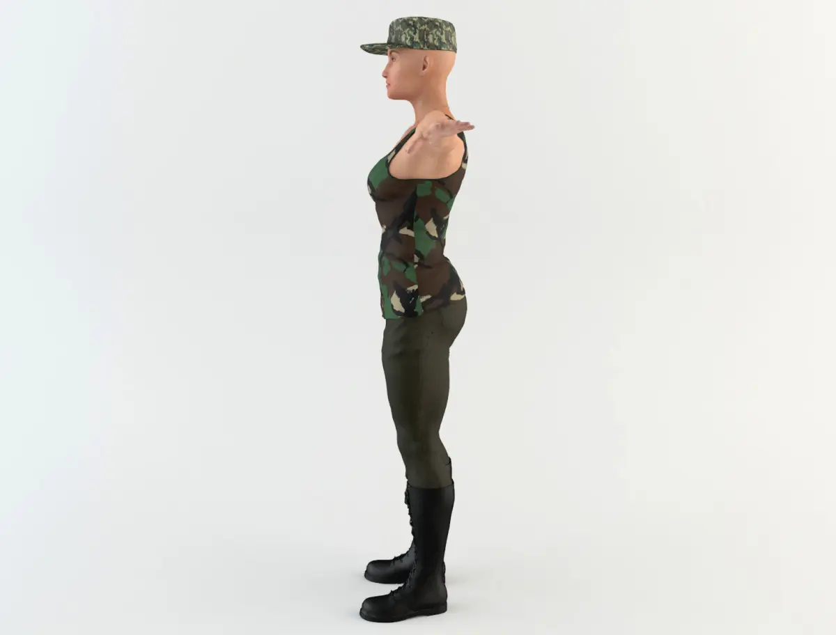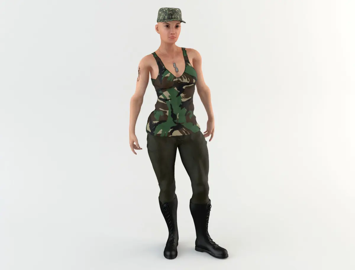 3D model of an military woman with military clothing. The model includes bones and four animations. Model ideal to be used in games, advertising and video production. High quality textures and materials. Medium and low-poly models to be used easily in any project.
