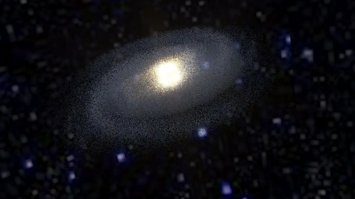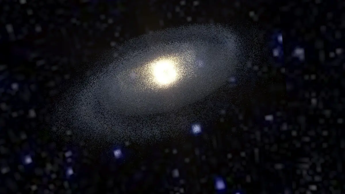 Model is a set of particle systems with elements of different types. Since real Milky Way contains hundreds of billions stars, there are no way of simulate realistic view of galaxy directly. So here used textured particles with complex materials, placed along structural parts of Galaxy. Some of them are “clouds” of stars, others are light absorbing dust, emitting hydrogenous clouds, individual super-giant stars, etc. Multi-layered complex shaders was specifically designed to retain detailed and realistic view with extreme closeup and inside-the-galaxy views