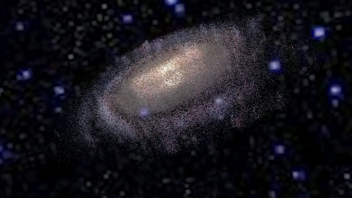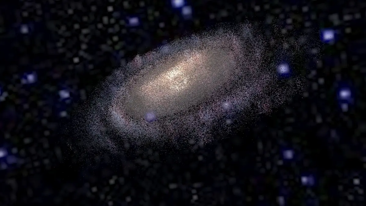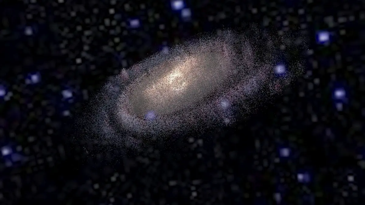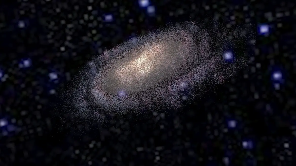 Model is a set of particle systems with elements of different types. Since real Milky Way contains hundreds of billions stars, there are no way of simulate realistic view of galaxy directly. So here used textured particles with complex materials, placed along structural parts of Galaxy. Some of them are “clouds” of stars, others are light absorbing dust, emitting hydrogenous clouds, individual super-giant stars, etc. Multi-layered complex shaders was specifically designed to retain detailed and realistic view with extreme closeup and inside-the-galaxy views