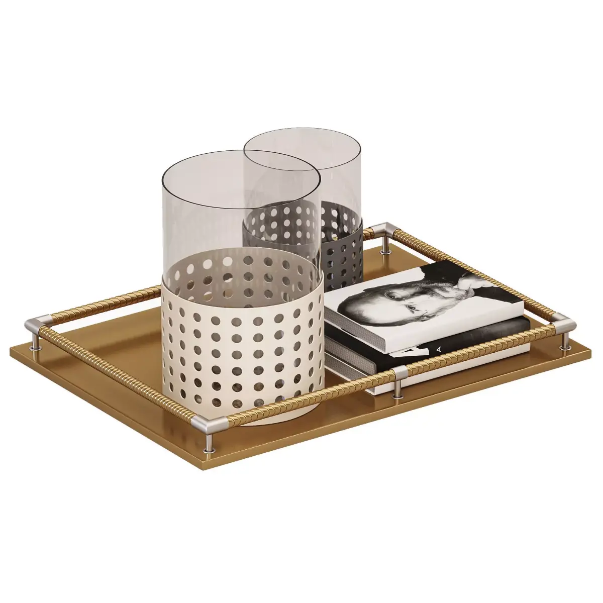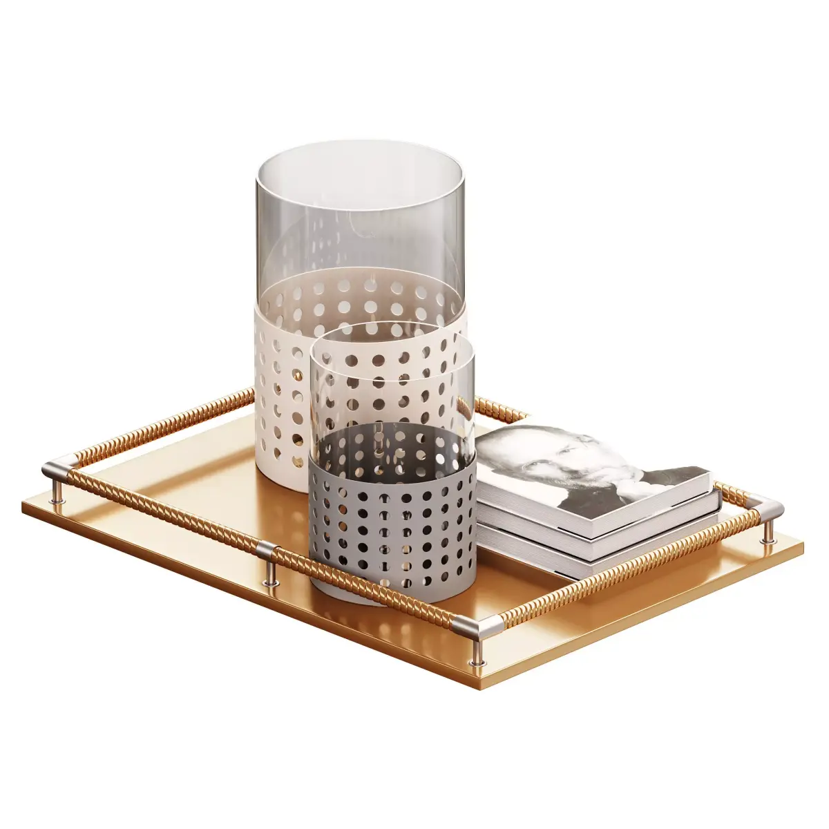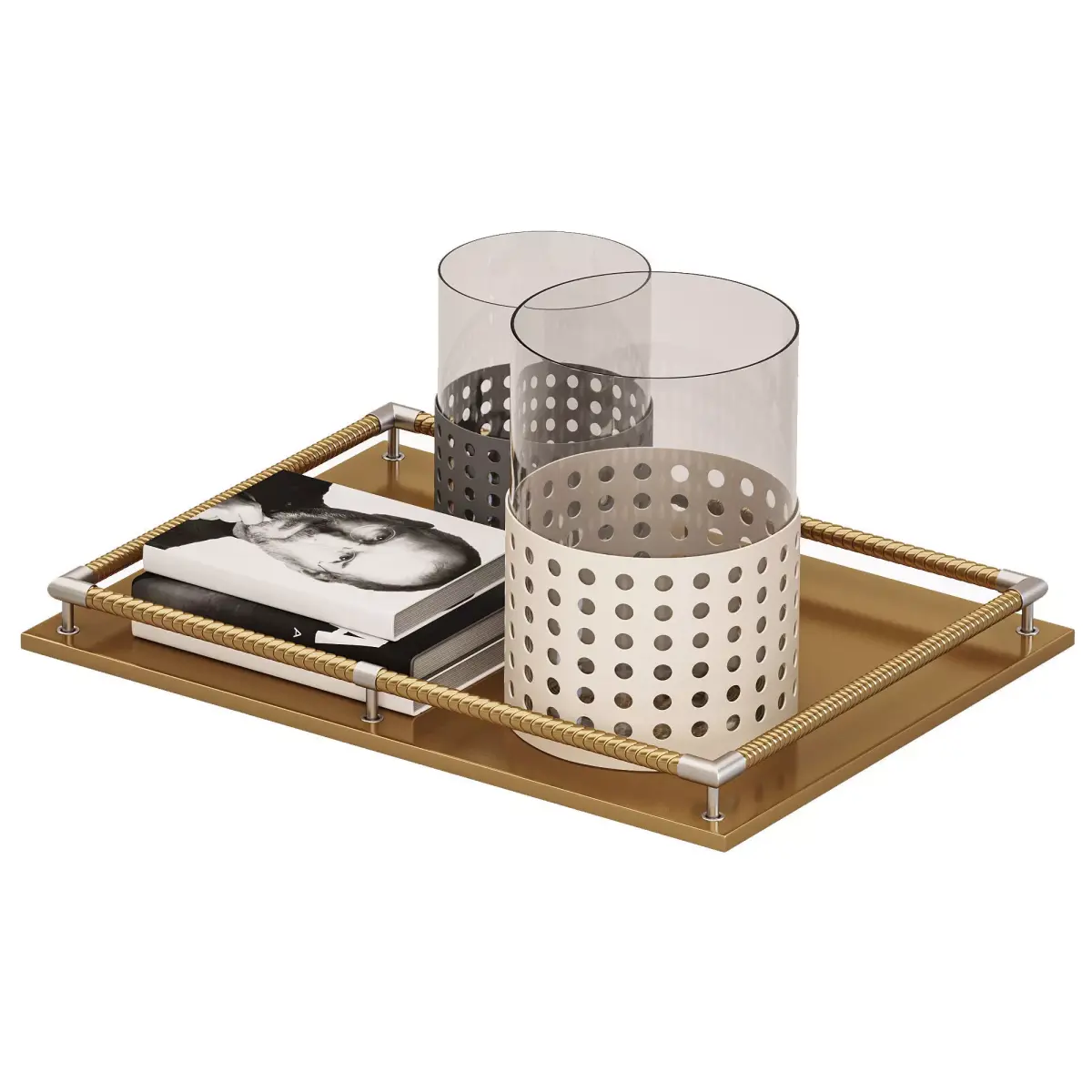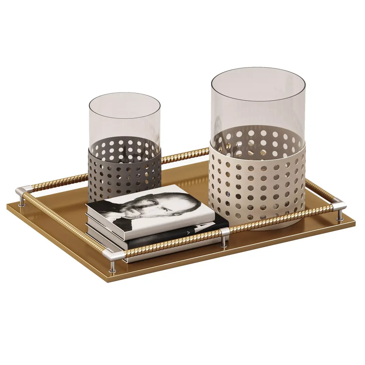 Name: Mimosa Large Moka GiobagnaraType: modelFormat: 3Ds Max 2016Export: FBX, OBJRender: Corona (10)Polys: 166718Verts: 166224Matclasses: CoronaLegacyMtlUnits: MillimetersDimension: 1165.25 x 856.35 x 604.53Description: A luxury decorative tabletop set featuring two cylindrical glass containers with perforated metal bases in contrasting moka and beige tones, placed on a rectangular golden tray with metallic rope-style handles. The model also includes a photo book stack, adding an elegant touch. Perfect for high-end interior scenes and product visualizations requiring refined details and realistic materials.Tags: tabletop decor, luxury tray, Giobagnara, moka finish, glass candle holder, metal perforated container, interior accessories, coffee table decor, modern tabletop, book stack 3D, realistic glass, Corona Renderer, decorative setup, high poly model, home decor 3D, design object, interior visualization, luxury interior, detailed decor model, stylish setup