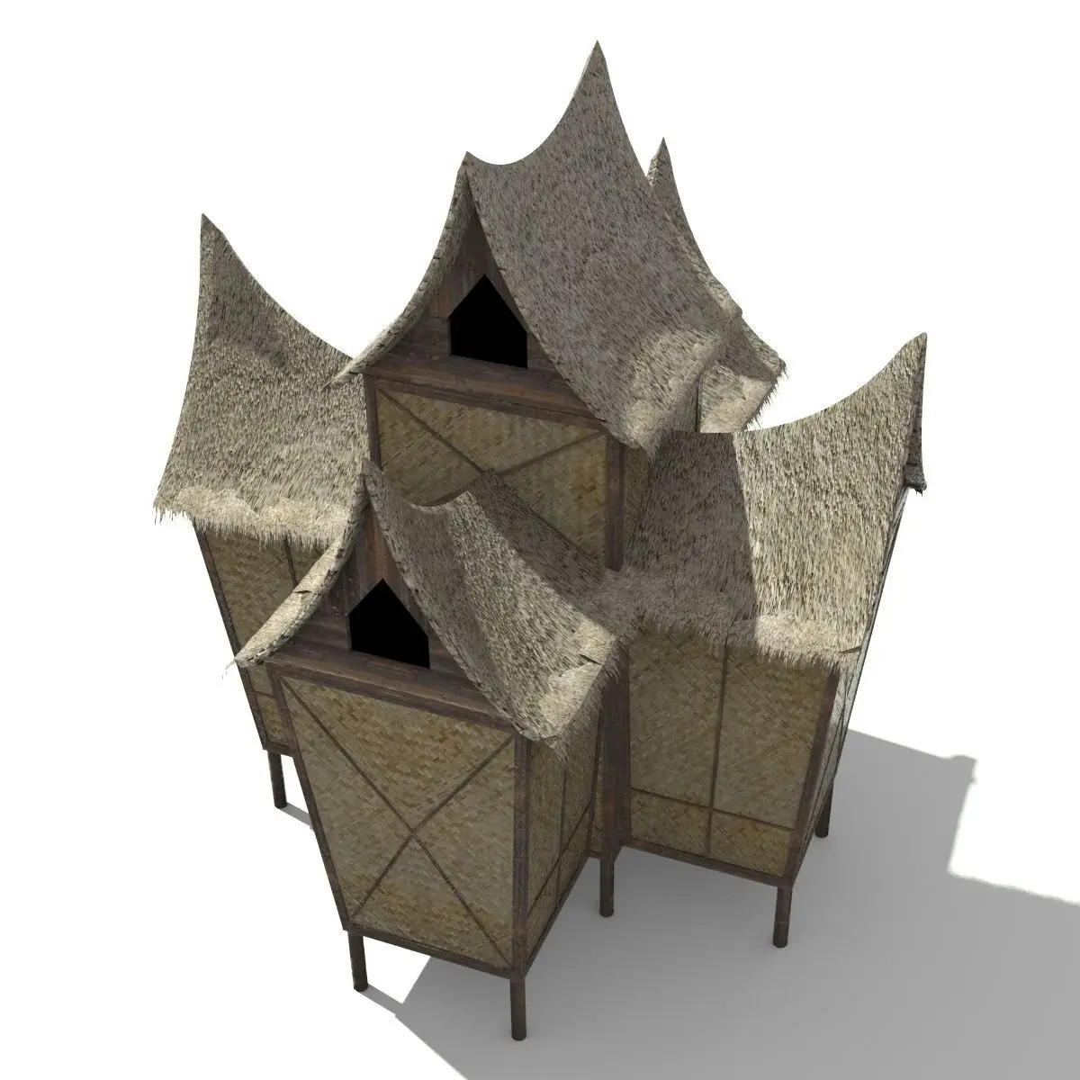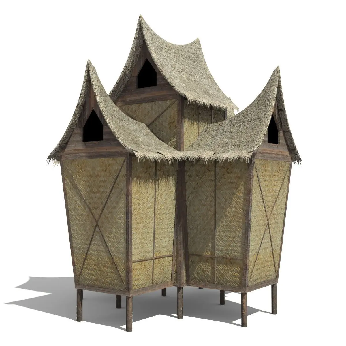 A traditional indonesian hut from Minangkabau region. This building is used to store rice and food. This is a traditional asian structure built in wood and bamboo.