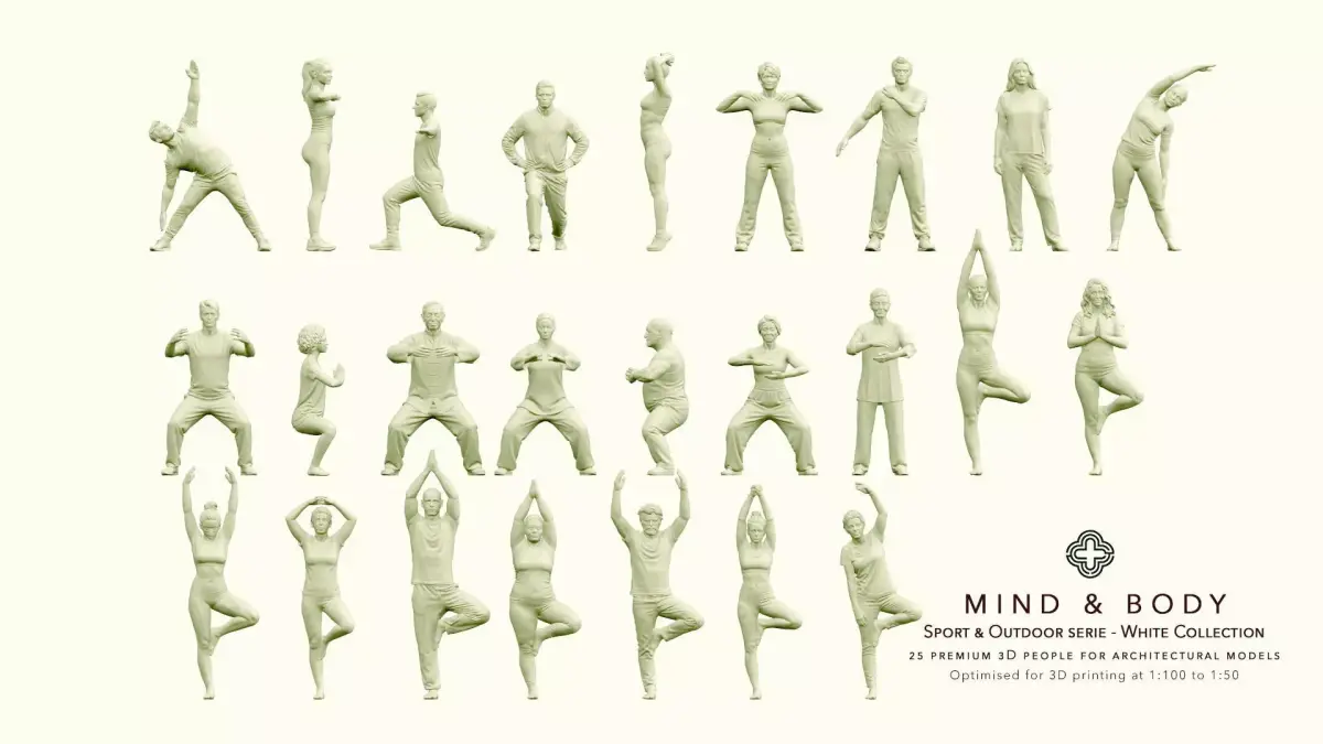 Inject serenity and life into your wellness projects with the Mind & Body pack. This set features 25 high-quality stylized figures captured in yoga, meditation, and relaxation poses. Designed specifically for architectural maquettes and visualization (ArchViz), these figures are essential for populating luxury spas, hotel pools, gyms, fitness centers, yoga studios, residential rooftops, and garden sanctuaries.