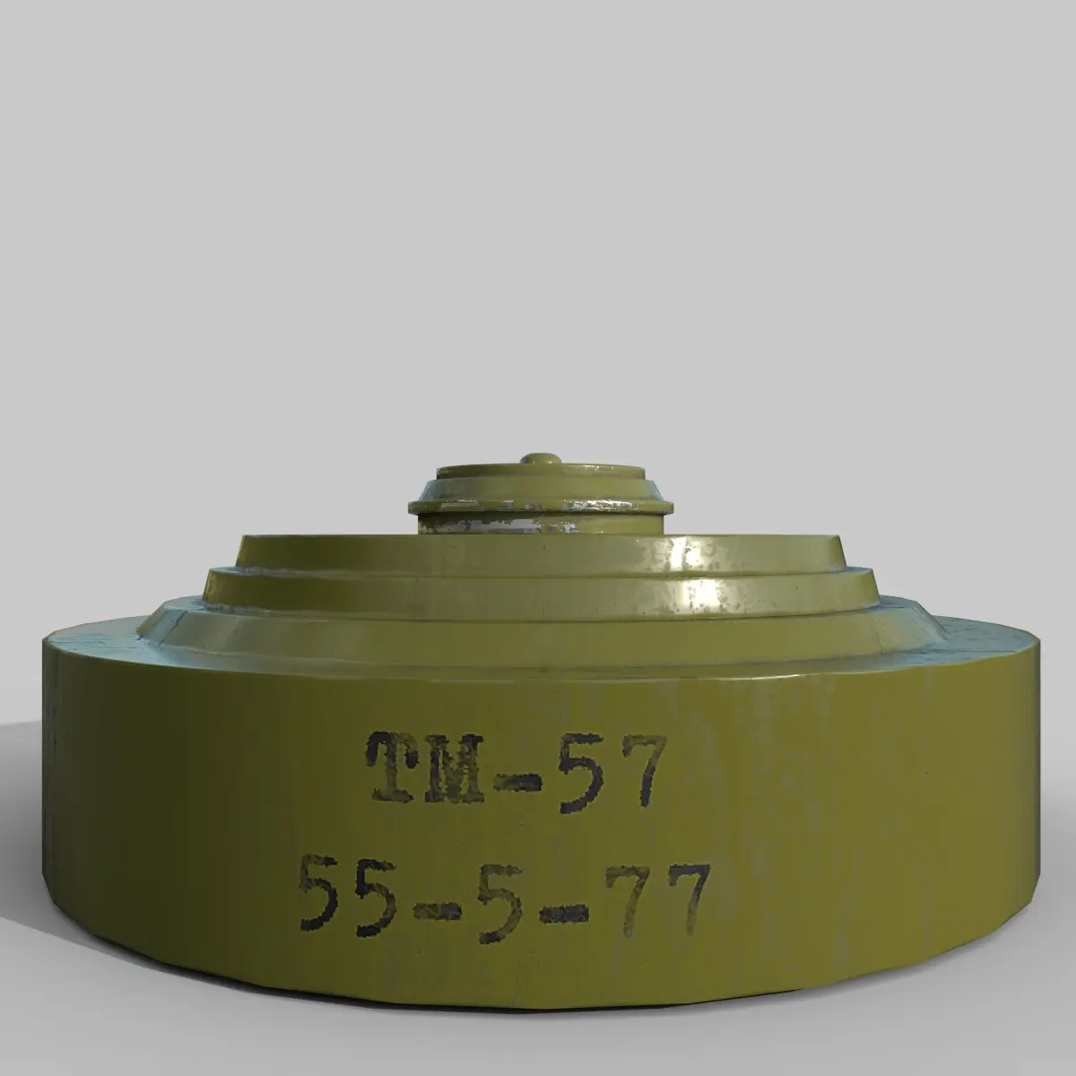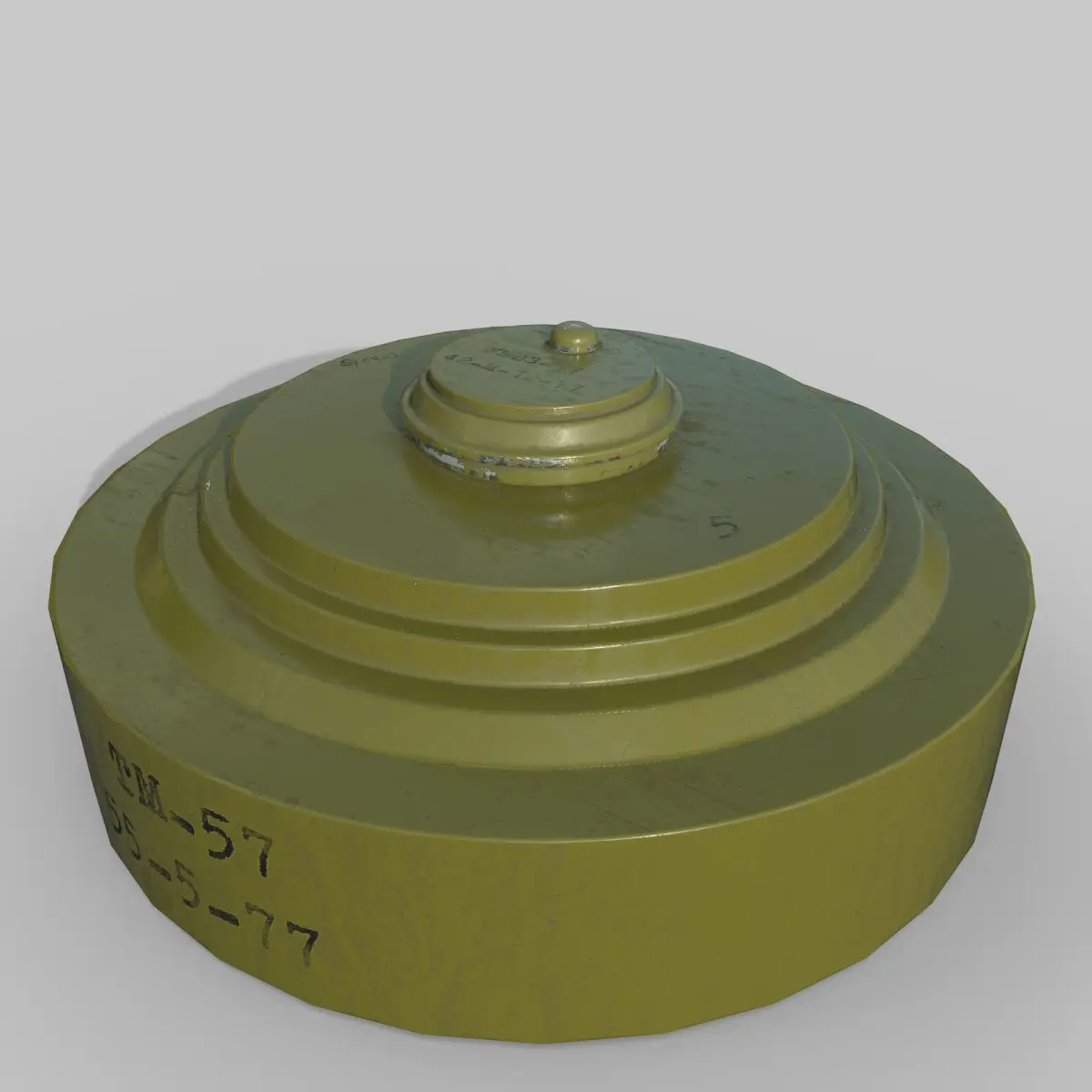 The TM-57 has a larger main charge and improved fuzing compared to the earlier TM-46. It is circular with a metal case and a central fuze well. A secondary pull-action fuze MUV-2 (Rus. МУВ-2) or VPF (Rus. ВПФ) pull and tilt fuze can be fitted on the side of the mine, which serves as an anti-handling device. The tilt rod fuze gives the mine improved resistance to blast; it is activated when it is forced to a deflection of 25 to 30 degrees. A training version of the mine that produces smoke is designated the TM-60.Diameter: 316 mmHeight: 102 mmCreated in Blender. Baked and painted in Substance painter.Render Iray. Mesh rendered Cycles. This model can be used for: game development, education, product presentation, personal projects and commercial projects.The archive contains a separate texture folders for Unreal Engine and Unity.