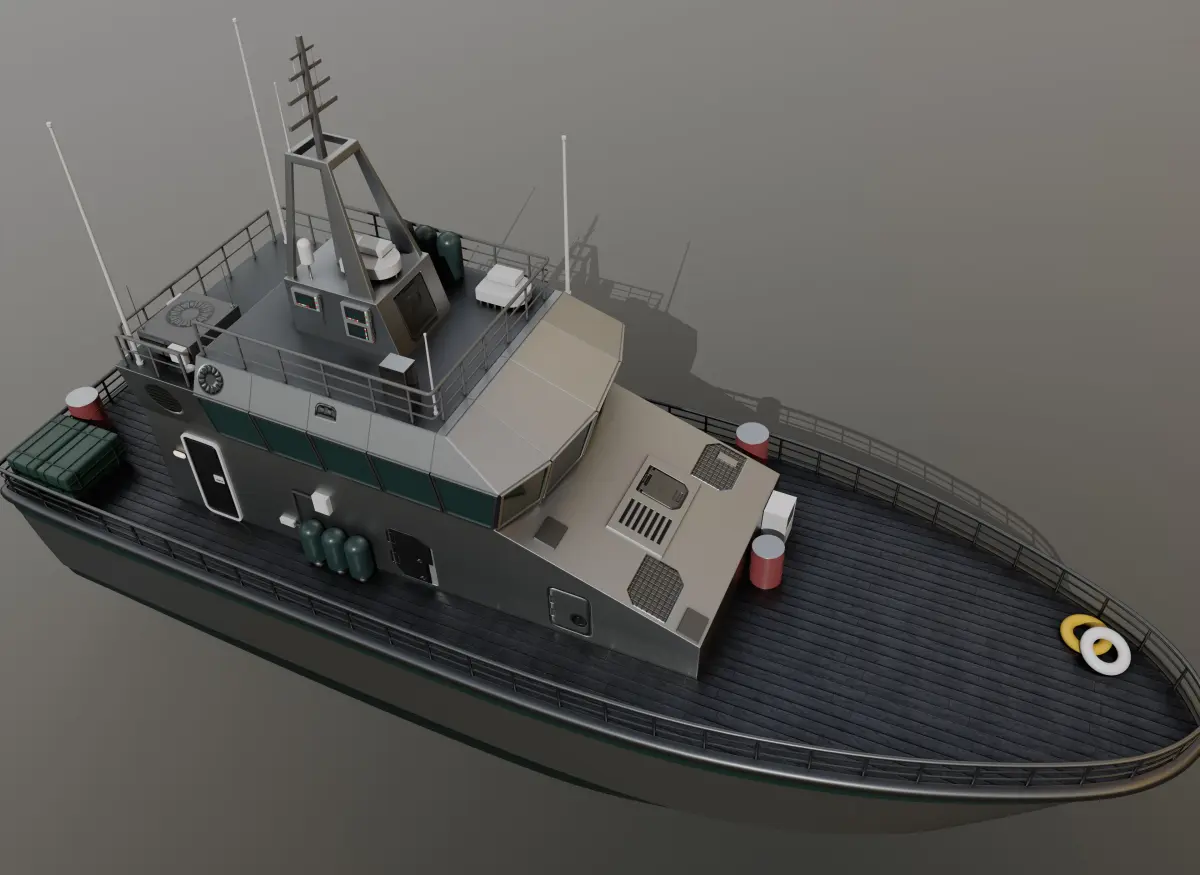 An agile Mine Countermeasure Vessel tailored for current naval operations, painted in a digital camo pattern of green and brown for optimal concealment in various maritime environments. The vessel is equipped with cutting-edge technology for detecting and clearing mines, ensuring safe passage for allied ships.