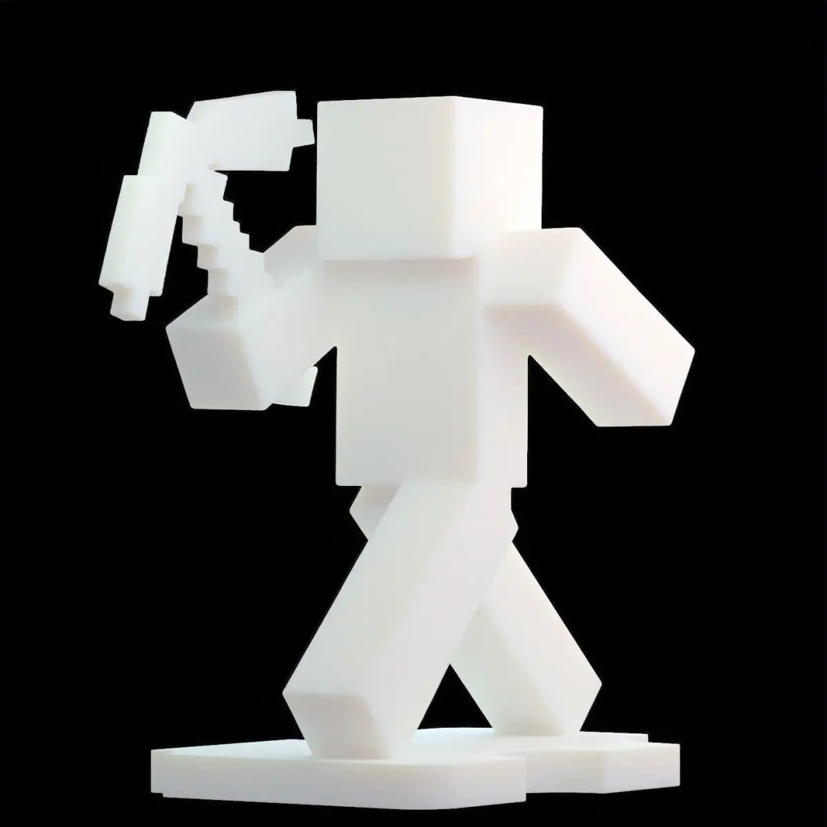 This Minecraft-style voxel character holding a pickaxe is a must-have for any voxel art or sandbox game fan! The design features the iconic blocky proportions and dynamic pose of a miner in action—perfect for display, collecting, or gifting.