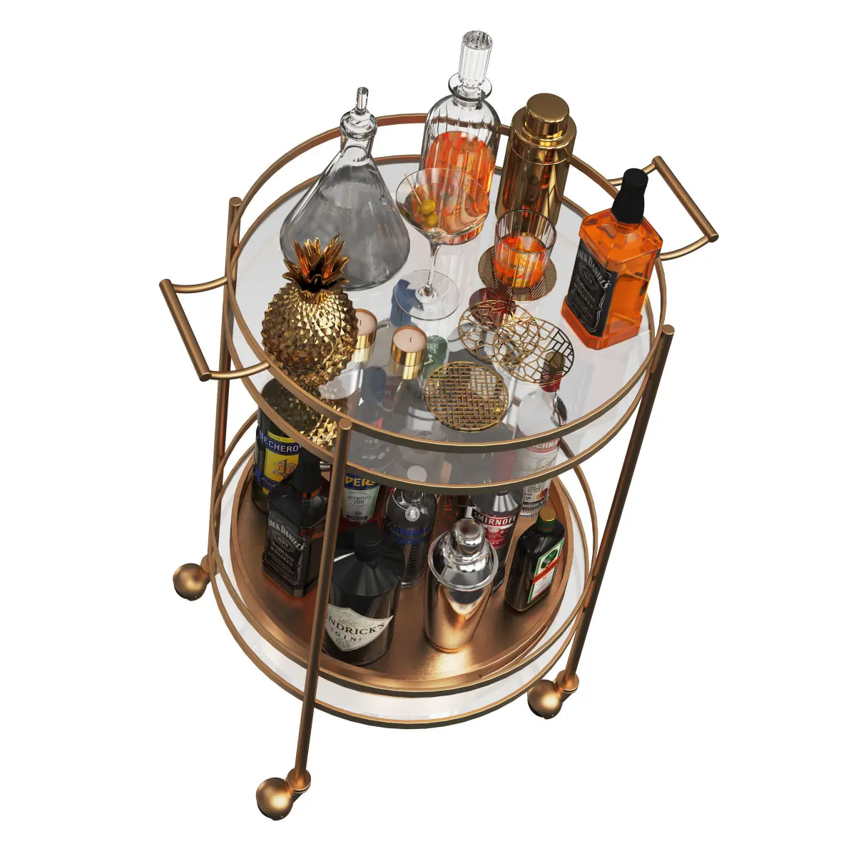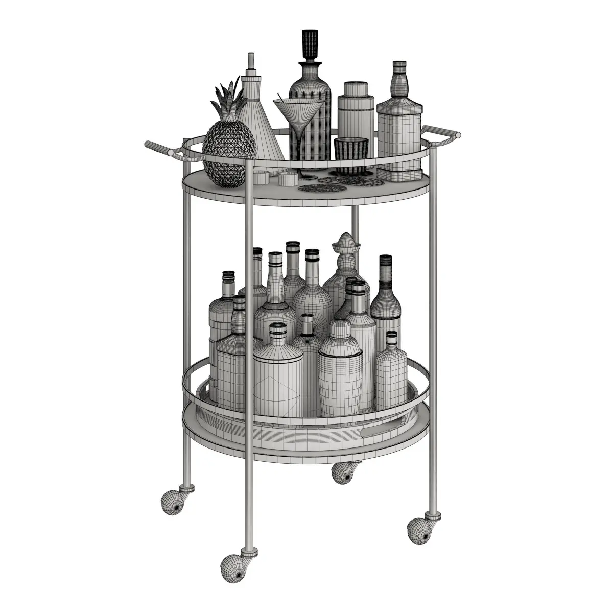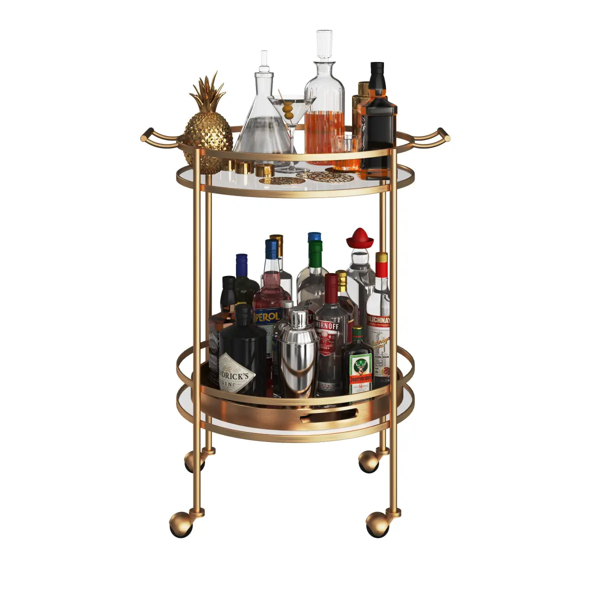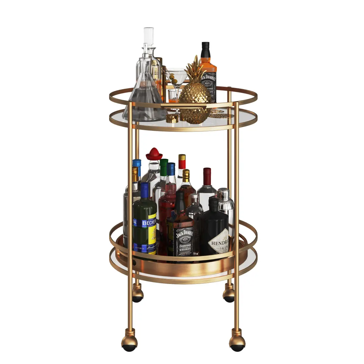 Mini bar table on wheels with bottles of alcohol and decor.