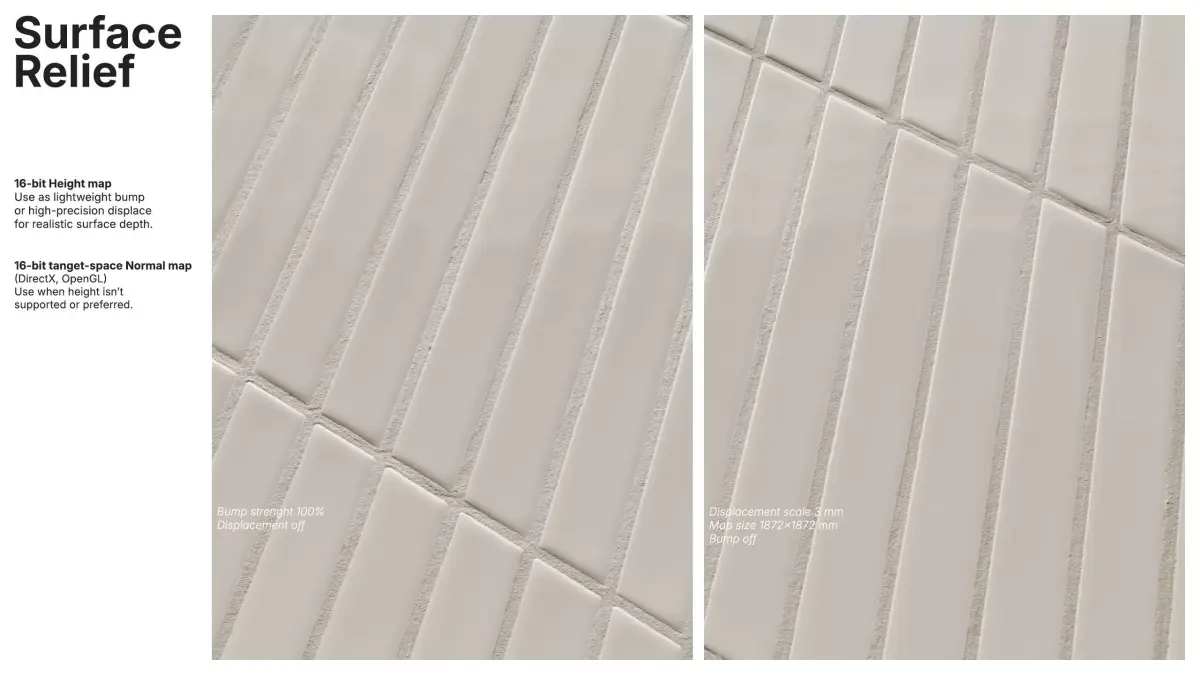 Surface relief is provided by a RAW 16-bit height map tuned for a true 3 mm depth (1872x1872 mm surface), suitable for lightweight bump or precise displacement. A 16-bit tangent-space normal map (DirectX/OpenGL) is included for cases where height-based workflows aren’t preferred.
