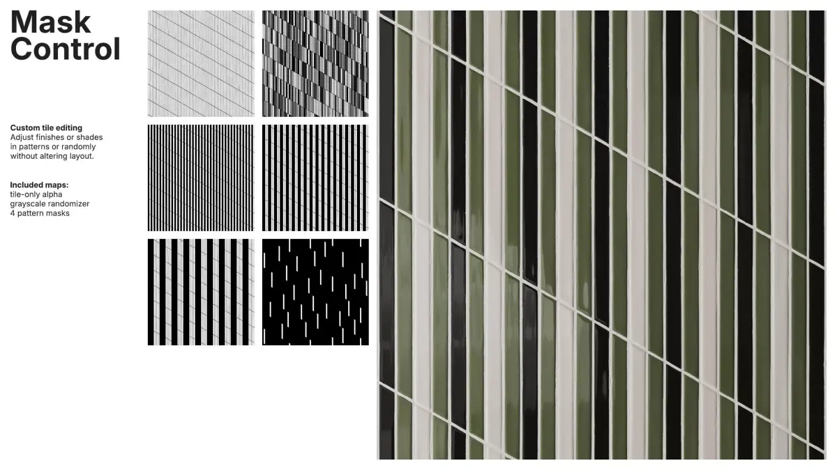 Pattern and random masks allow independent control of tile and grout colors, enabling global, per-pattern or per-tile adjustments without disturbing the layout. Tile-only alpha, a grayscale randomizer and pattern masks ensure full customization for complex designs.