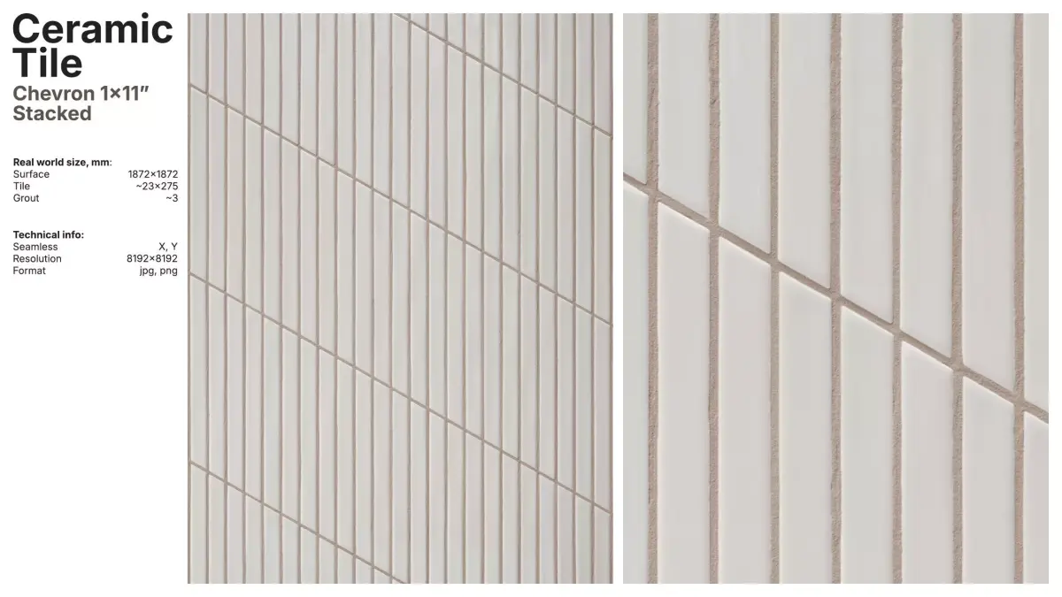 The package includes 8 diffuse variations with matching grout tones, and a flexible color base that works out-of-the-box or as a starting point for custom looks.