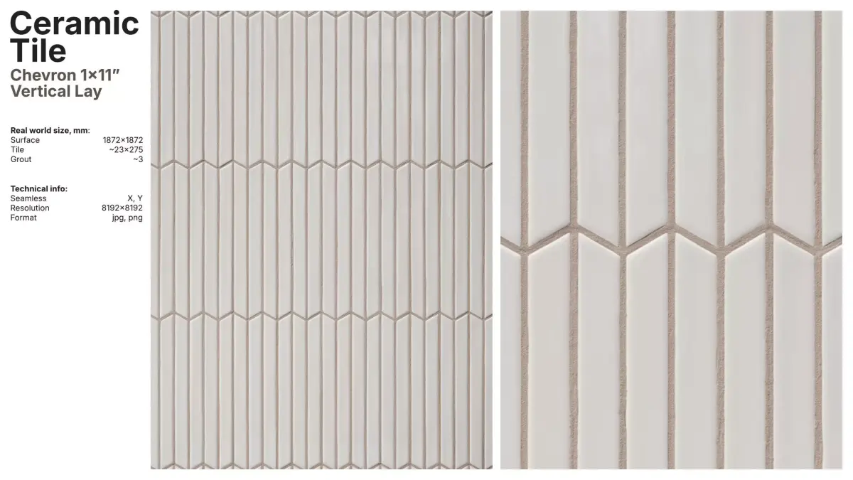 Glazed artisan ceramic tile material in a chevon 1x11 inch format arranged in a vertical layout.
