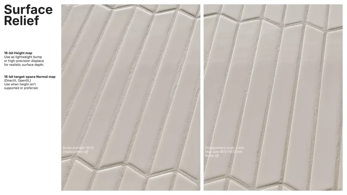 Surface relief is provided by a RAW 16-bit height map tuned for a true 3 mm depth (1872x1872 mm surface), suitable for lightweight bump or precise displacement. A 16-bit tangent-space normal map (DirectX/OpenGL) is included for cases where height-based workflows aren’t preferred.