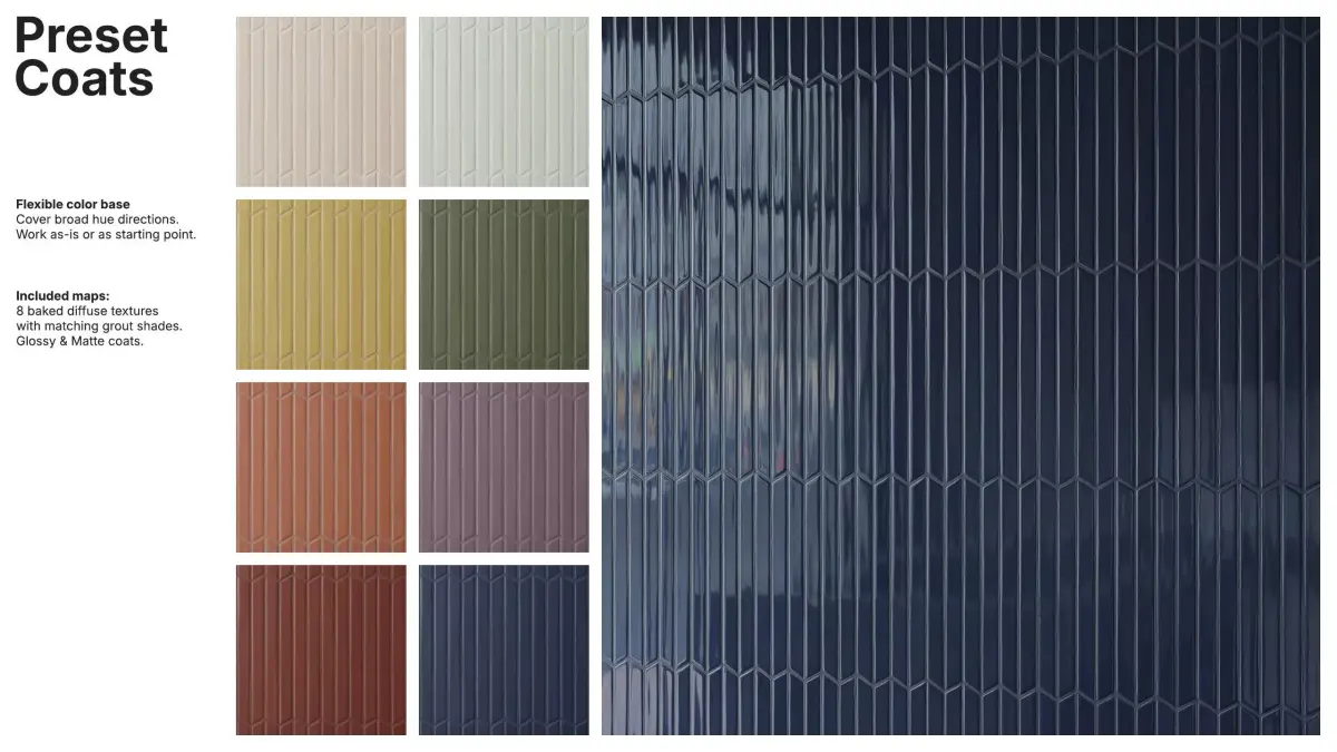 The package includes 8 diffuse variations with matching grout tones, and a flexible color base that works out-of-the-box or as a starting point for custom looks.
