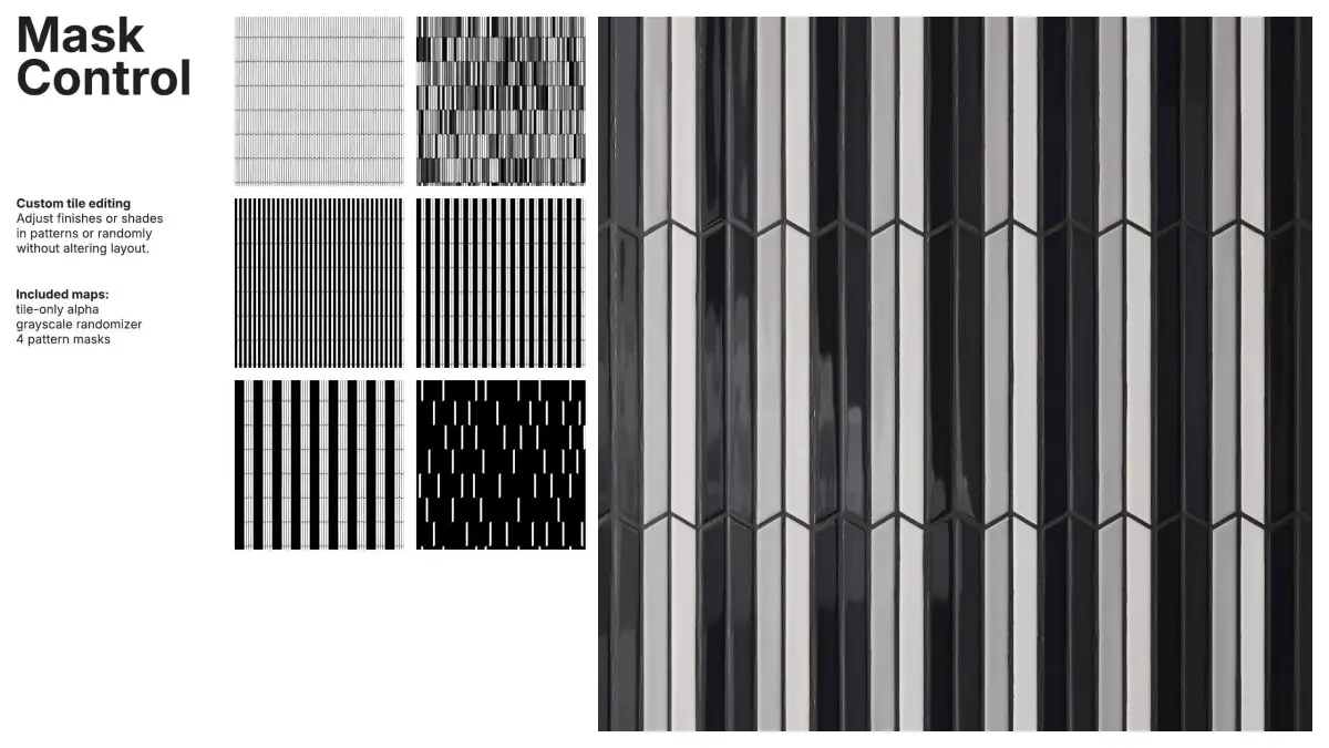Pattern and random masks allow independent control of tile and grout colors, enabling global, per-pattern or per-tile adjustments without disturbing the layout. Tile-only alpha, a grayscale randomizer and pattern masks ensure full customization for complex designs.