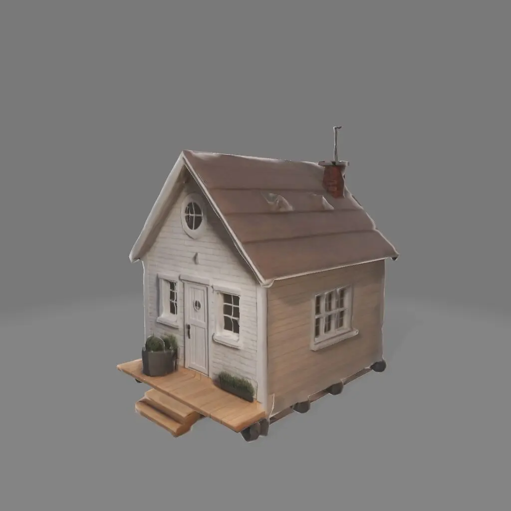 A 3D printed model of a charming tiny house, designed with intricate details for a cozy and inviting feel. This compact structure features a pitched roof, small windows, and a welcoming front door. Realistic textures, such as wooden planks or brick patterns, enhance its appeal. A tiny chimney and optional outdoor details like steps or a porch add character, making it an ideal decorative piece or a perfect addition to a diorama scene.