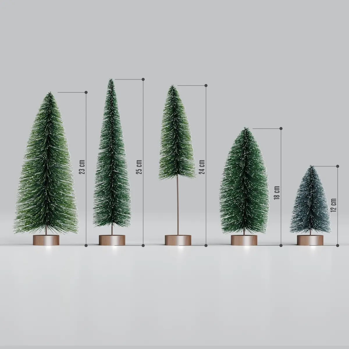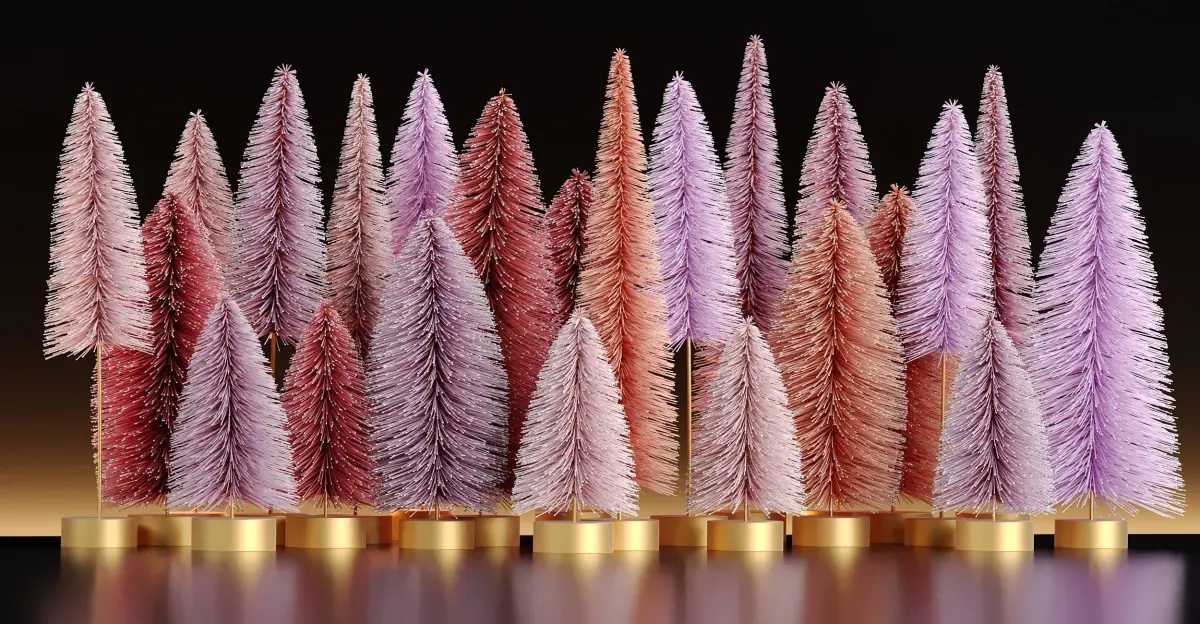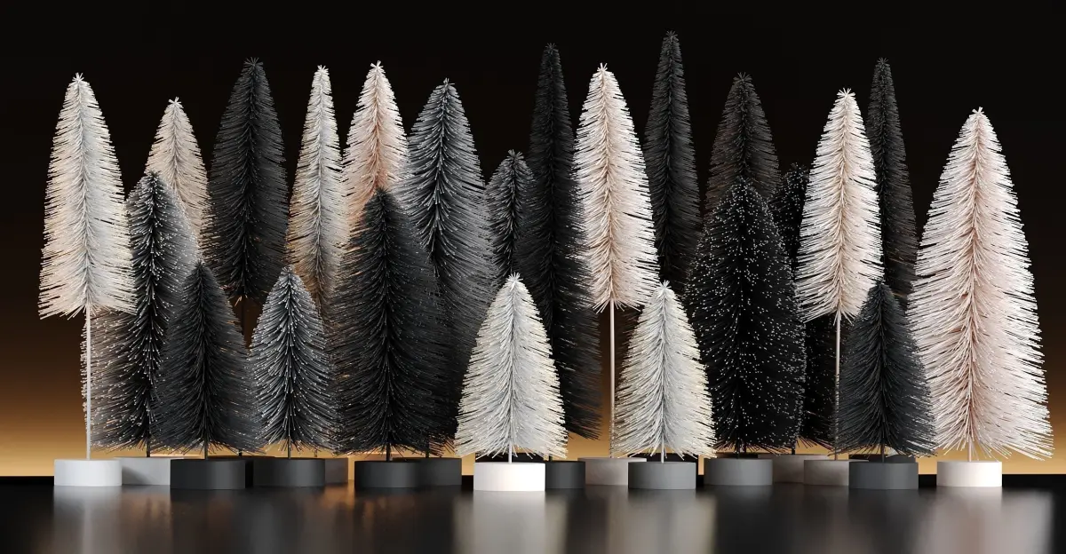 Miniature Christmas tree set made for decoration, the trees height vary from 12cm to 25cm.The small trees are available in three color themes, natural green set, red & purple set and black & white set. Each set consists of a variation of these colors provided in one multi-texture material for random instances.