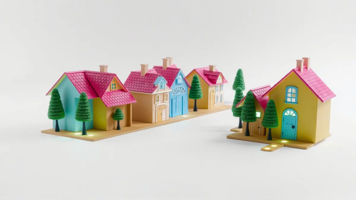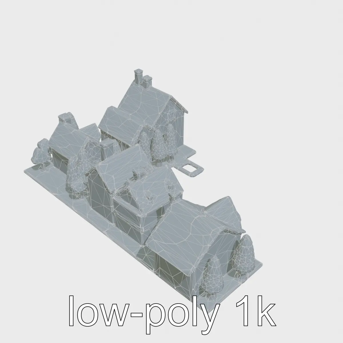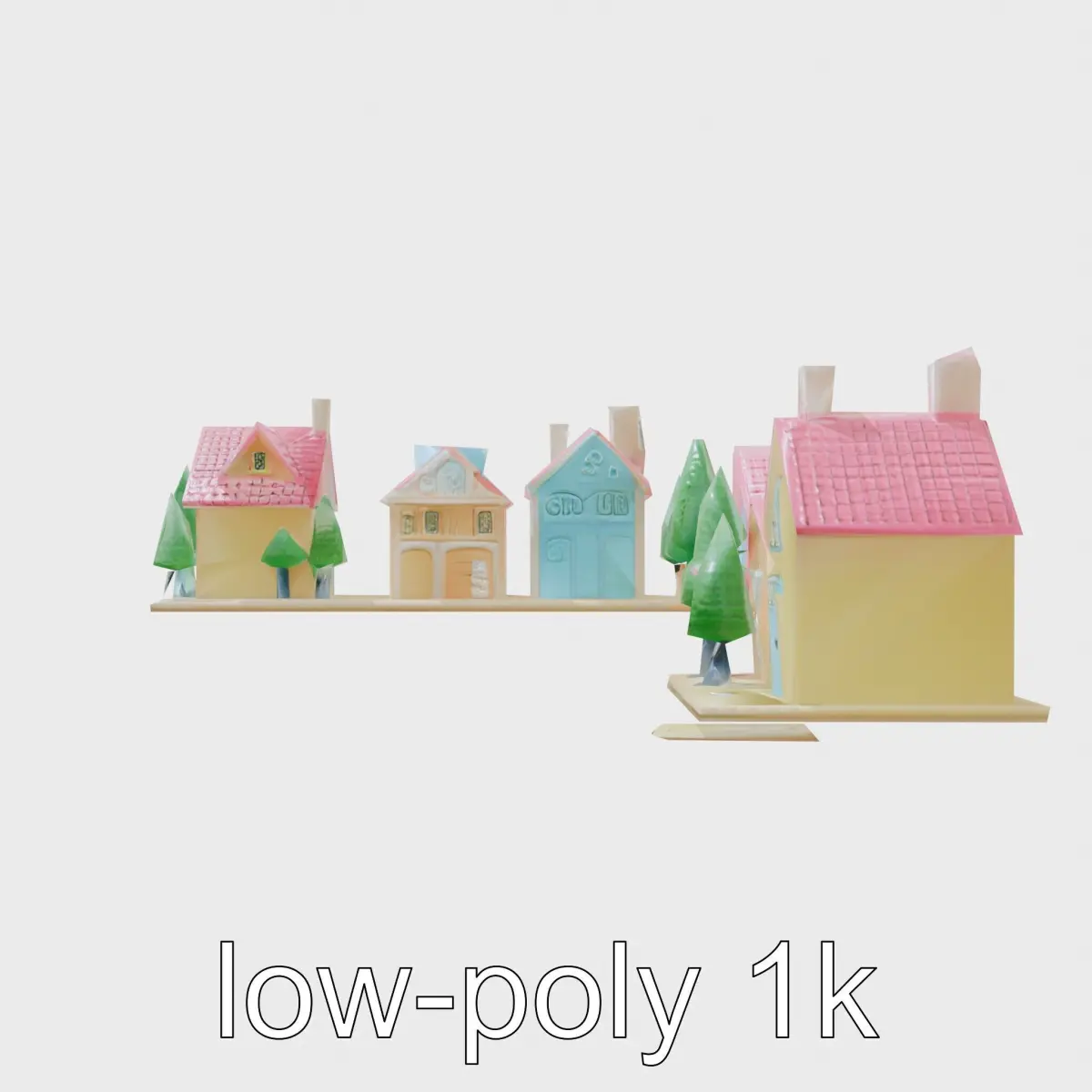 Each model has 3 levels of detail: low-poly, middle-poly, and high-poly, which allows for the use of this model in production rendering(such as 3ds max, Maya, Cinema4D, Blender, Vray/Corona/Cycles, and all others), game engines (Unity and Unreal compatible), and interactive presentations, providing a choice of detail based on the LOD System principle. This set of miniature townhouses with pink roofs and blue facades is perfect for use in toy design, animation projects, and simulated environments for games. The model's textures are PBR, Diffuse, NormalMap, and reflection/roughness/metallic, which are suitable for any modern rendering engine. All models are accurately unwrapped and have no overlapping UV. Textures are 4096*4096 in size. Please like and leave a comment if you enjoyed this model.