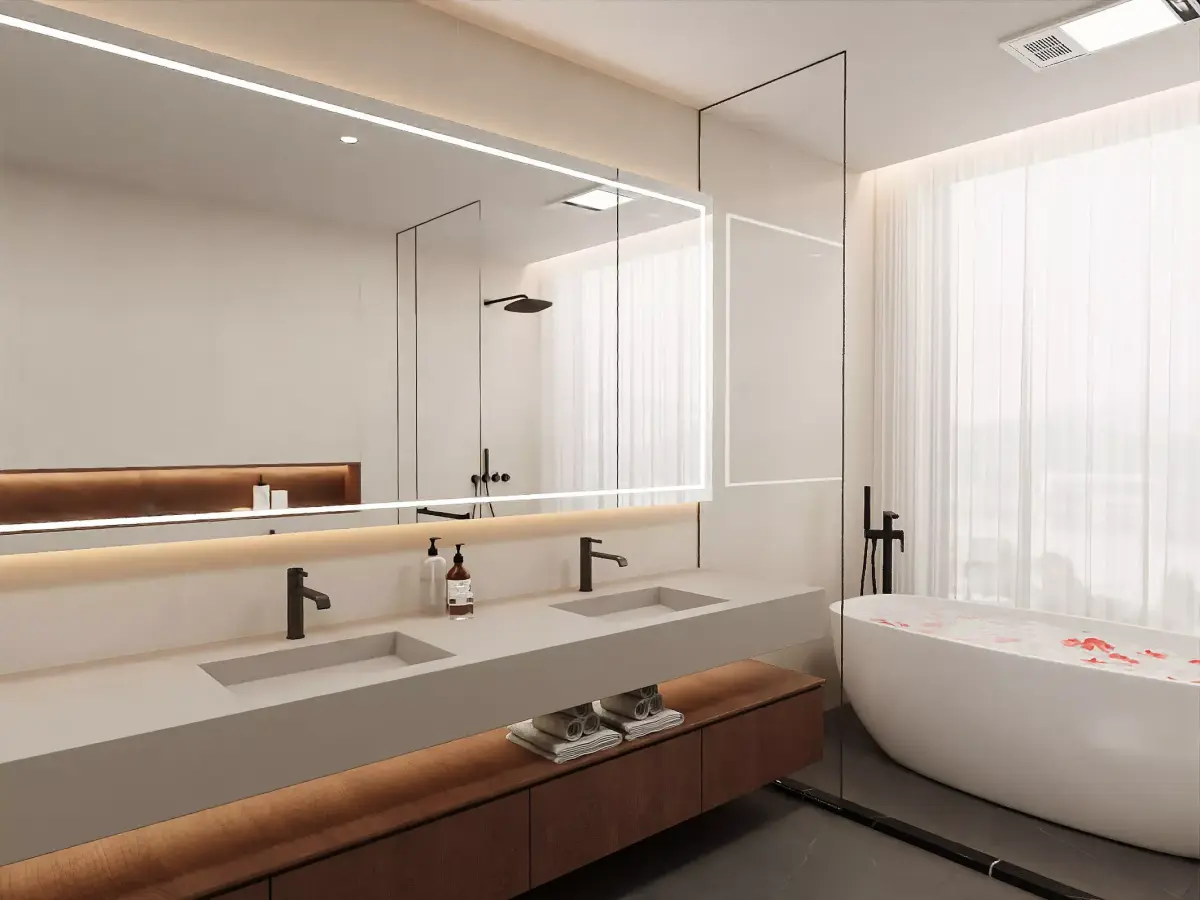 This set delivers a minimal, light-luxury bathroom centered on a sleek freestanding tub, a wall-hung toilet and a walk-in shower with matte-black fixtures. Calm cream walls pair with warm wood cabinetry and a continuous wall niche with LED strip, creating a refined hotel-suite vibe. The double vanity is modeled as a single slab with two integrated basins; pivots are placed for easy editing (doors, drawers, fittings). Objects are logically grouped (fixtures, tub, vanity, glazing, lighting, props) and named for quick selection. Real-world scale and clean, mostly-quad topology make the scene friendly to close-ups. All materials use a metal/roughness PBR workflow with non-overlapping UVs; tileable maps for stone/wood are included so you can increase tiling density without texture stretching. Glass, water and emissive channels are set for fast look-dev; black hardware can be switched to chrome by changing base color/roughness. Ideal for apartments, hotels and spa visuals, for stills or animation.