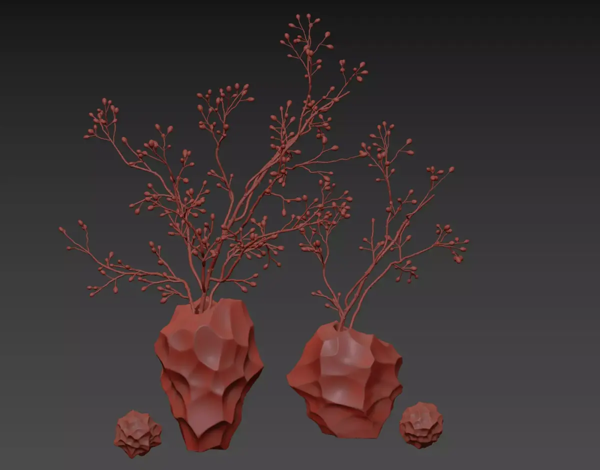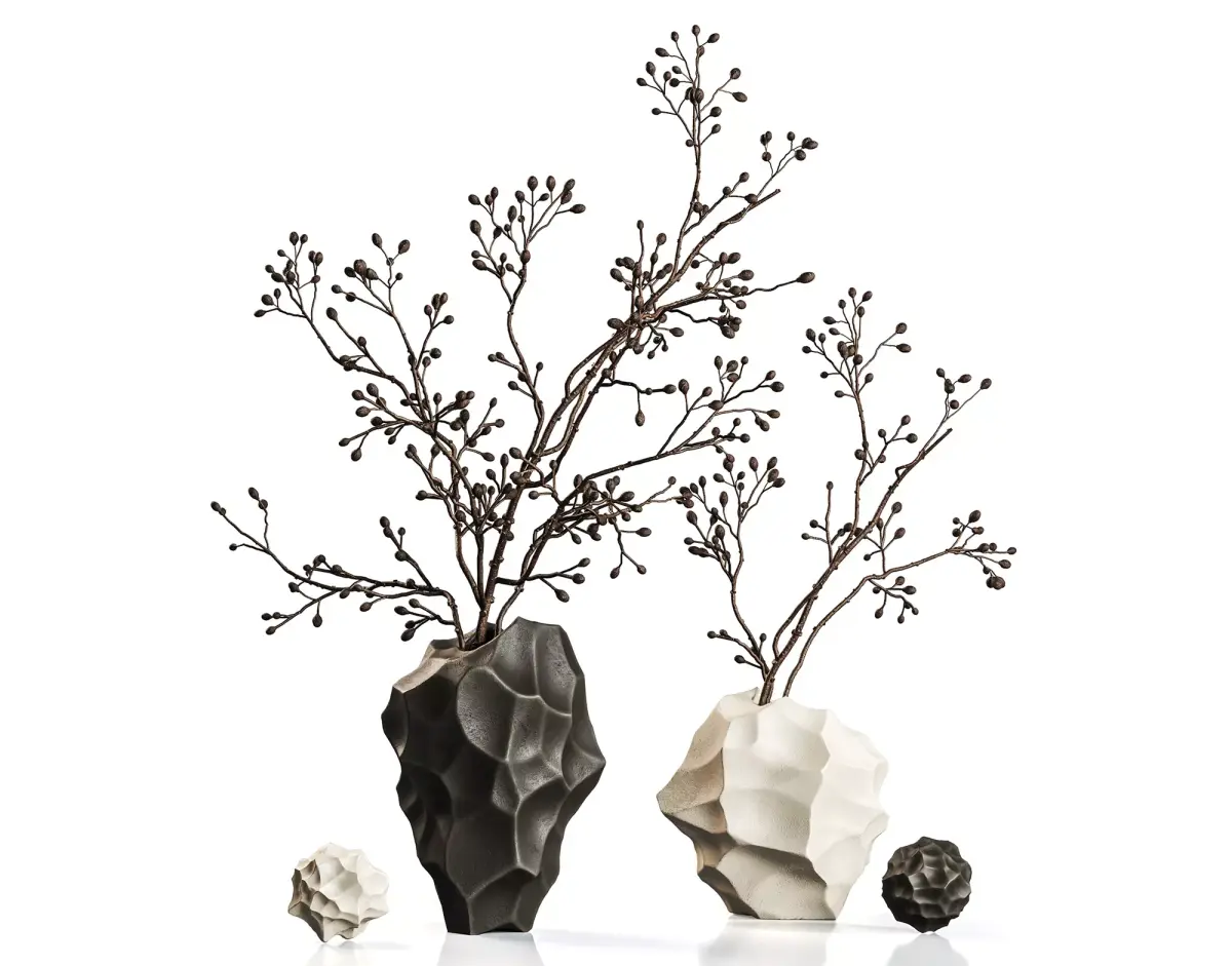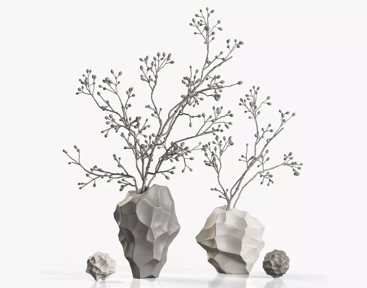 A realistic 3D model of a minimal stone vase set featuring soft, organic shapes and a raw, matte stone texture. This modern decorative set is ideal for Japandi, Scandinavian, or neutral-toned interior scenes. The model includes three unique vases with slightly varied forms and natural surface imperfections for added realism.