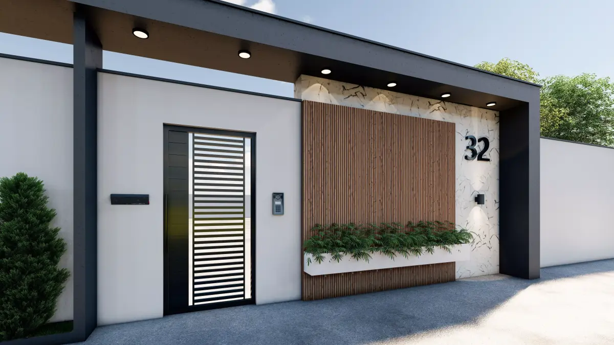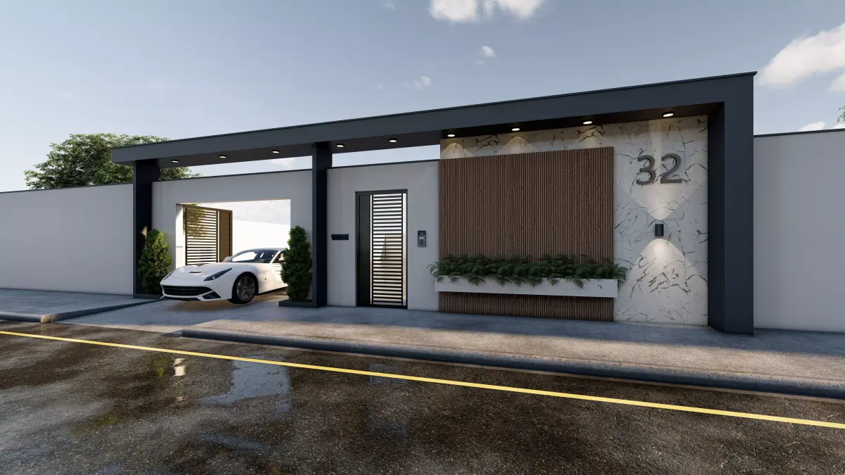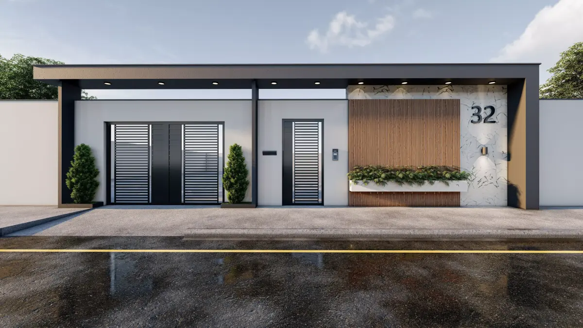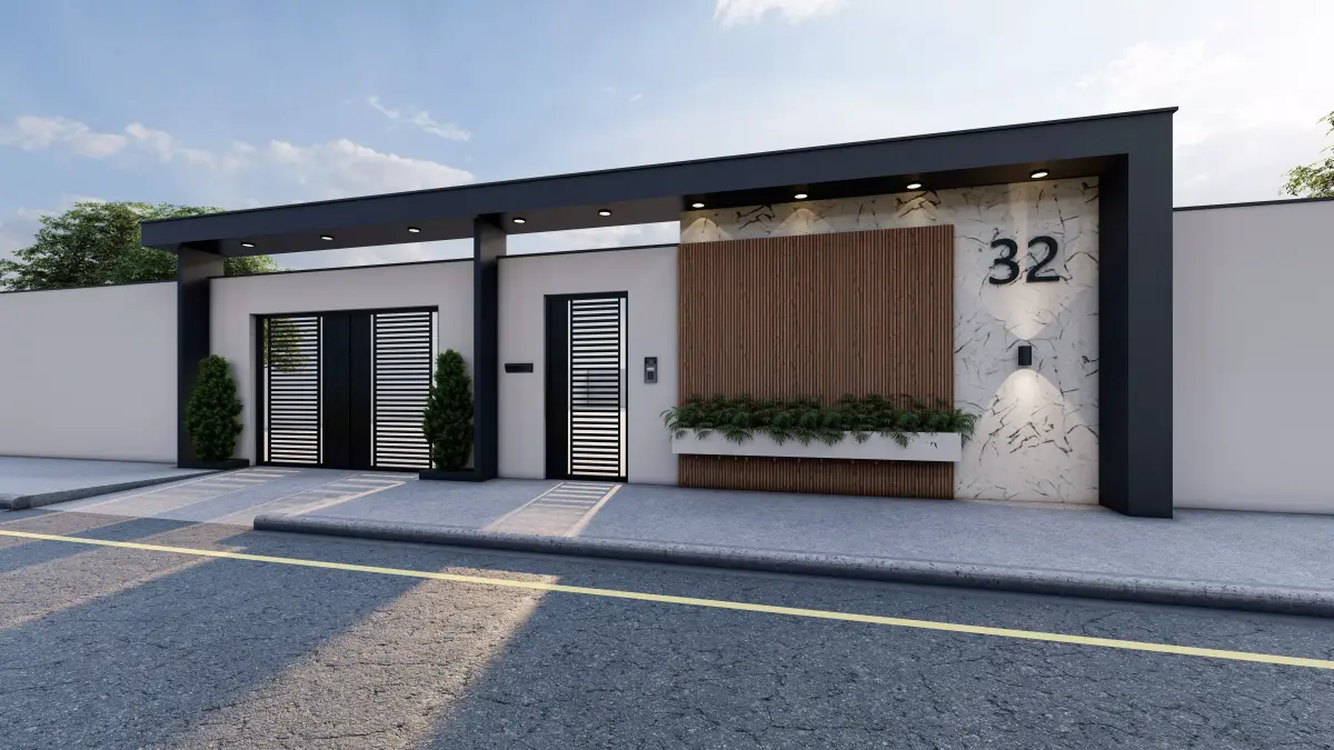 This is a modern minimal villa entrance gate 3D model, designed with clean geometry and contemporary architectural details.The design includes:Modern metal entrance gateWooden vertical panelMarble/stone wall textureIntegrated planter boxExterior wall lightingHouse number detail