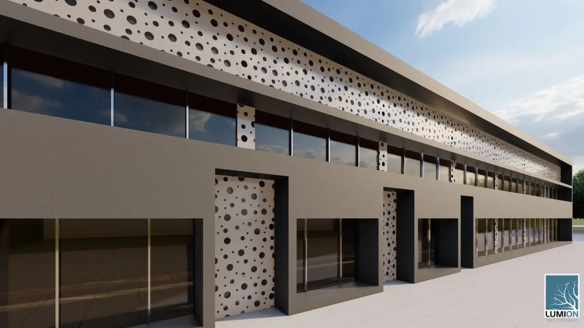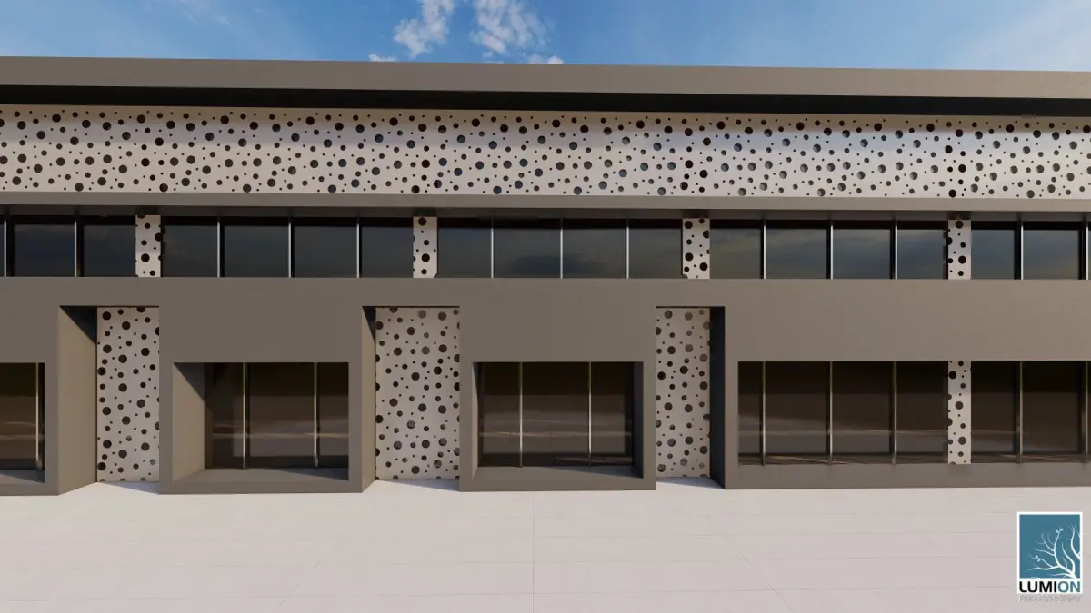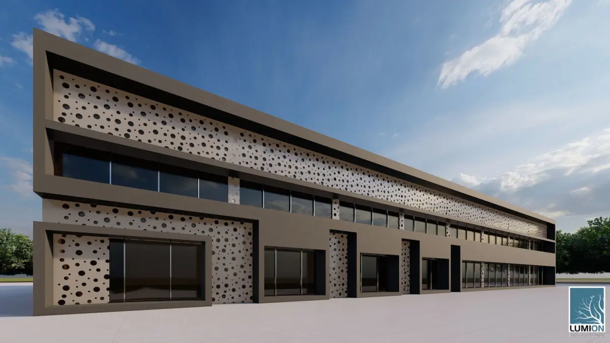 This clean and modern 3D model represents a minimalist two-story building, perfect for use in architectural presentations or real estate development projects. The structure features large windows on both levels, providing a sleek and contemporary facade. The upper level's geometric design with subtle texturing adds depth and visual interest to the building. Designed in Lumion, this model is highly detailed, with high-resolution textures and accurate lighting for realistic renders. Ideal for architects, designers, and 3D artists looking to showcase modern commercial or residential buildings in their portfolios or projects.