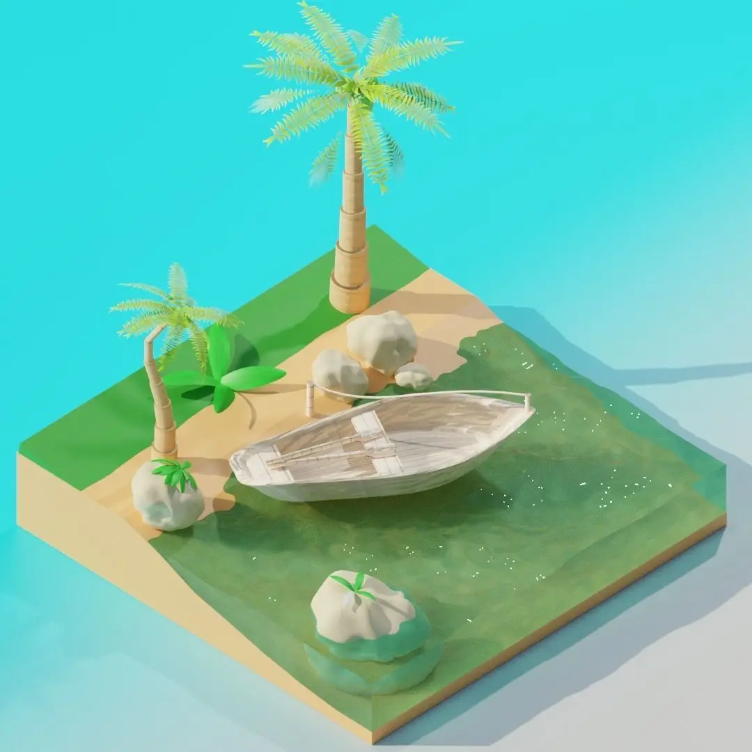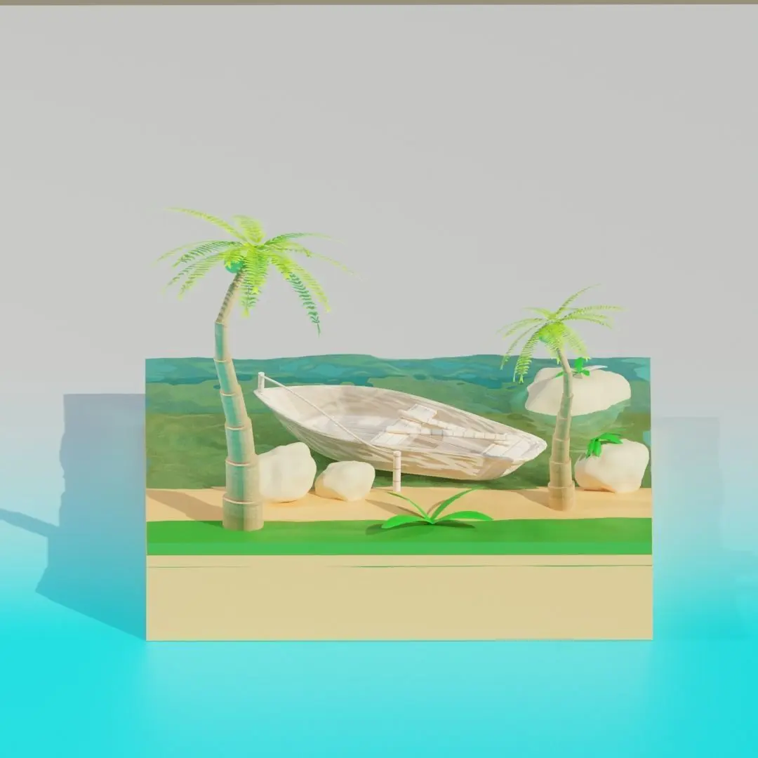 Minimalist beach / coast. beautiful small beach with boat and palm trees.