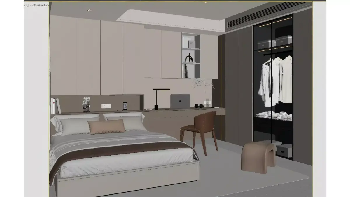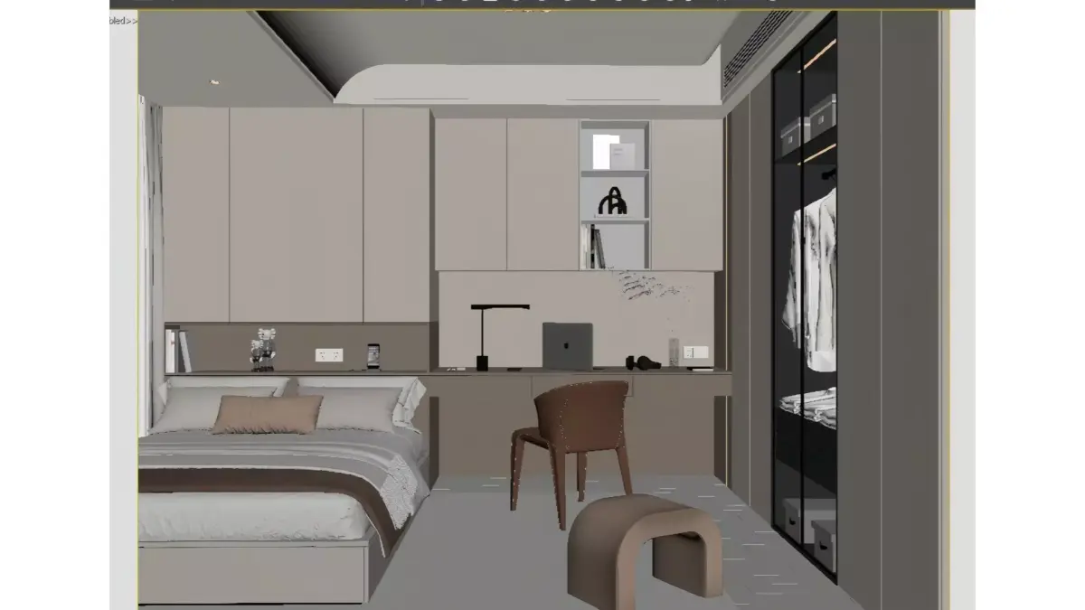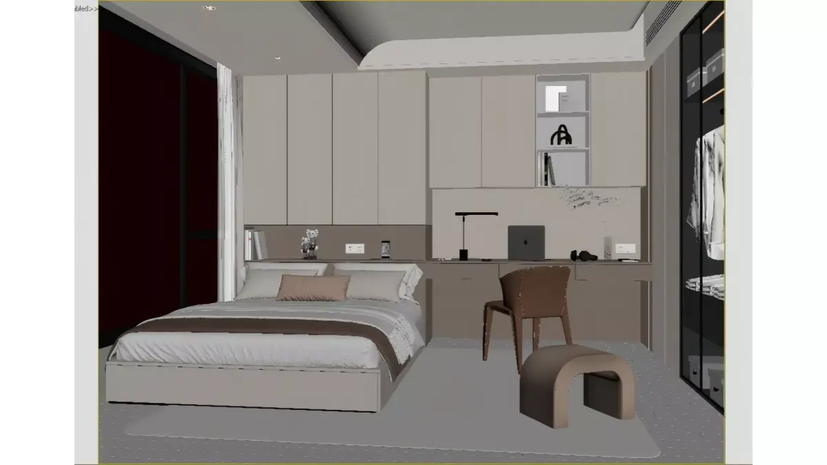 This is a multi-functional bedroom designed around a modern minimalist core, with soft off-white and light wood tones as the main color palette, creating a warm and soothing living atmosphere. The space seamlessly integrates the sleeping area and the office area, and custom wall cabinets and floating suspended ceilings enhance the overall storage capacity and visual neatness.Large floor-to-ceiling windows let in ample natural light, and when paired with a recessed lighting system, they add more layers to the space. Delicate details such as the glass-door wardrobe and curved low stool not only ensure functional practicality but also bring a touch of light luxury texture, making it an ideal urban residence that combines comfortable living with efficient working.