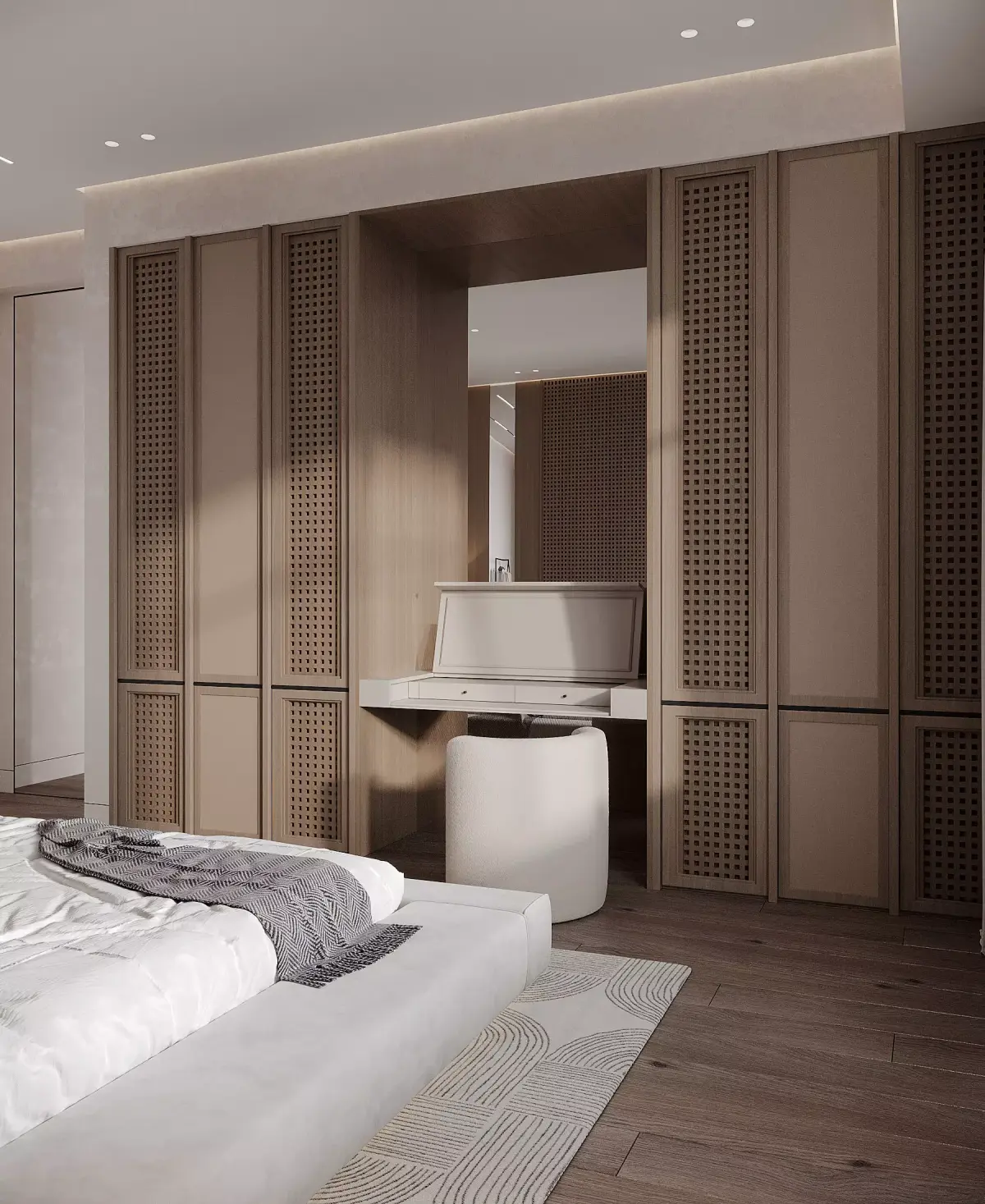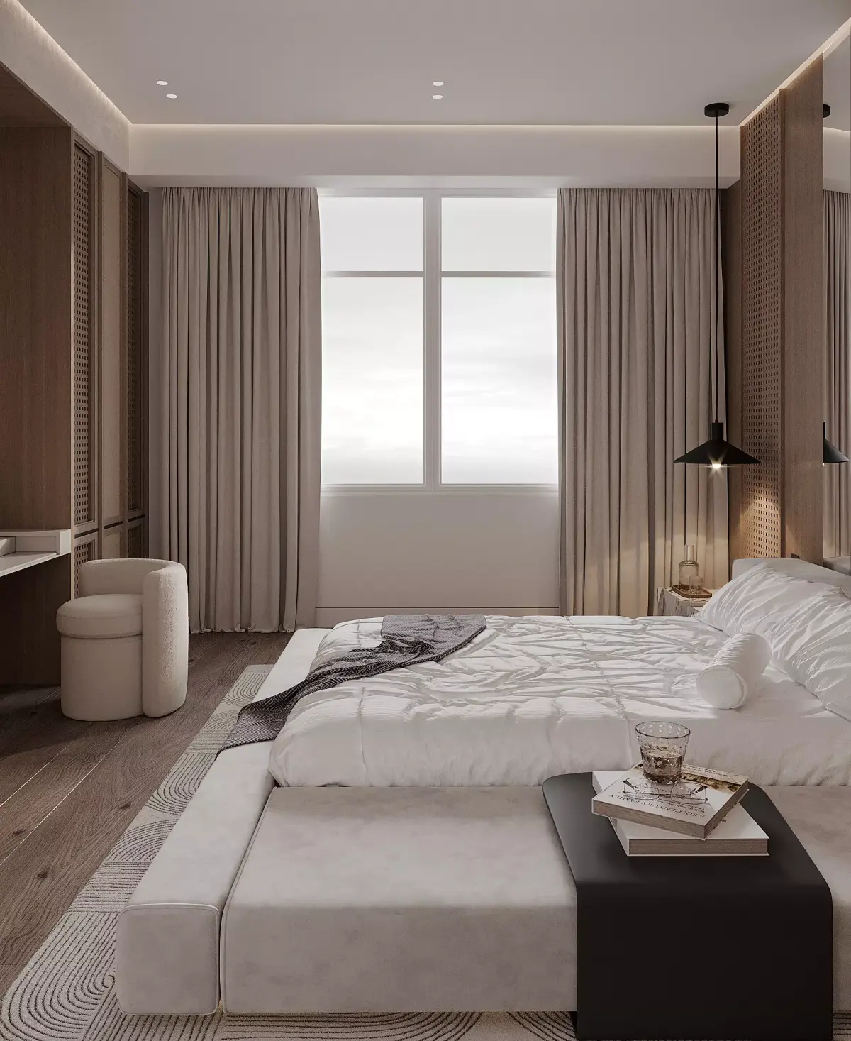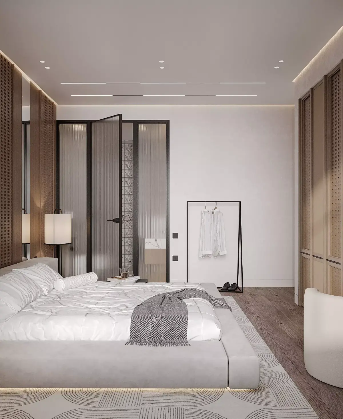 A neutral color palette is used to enhance the sense of openness and light, while carefully selected materials add subtle texture and depth without overwhelming the space. Furniture and decorative elements are kept minimal, ensuring a timeless and elegant aesthetic aligned with modern living standards.