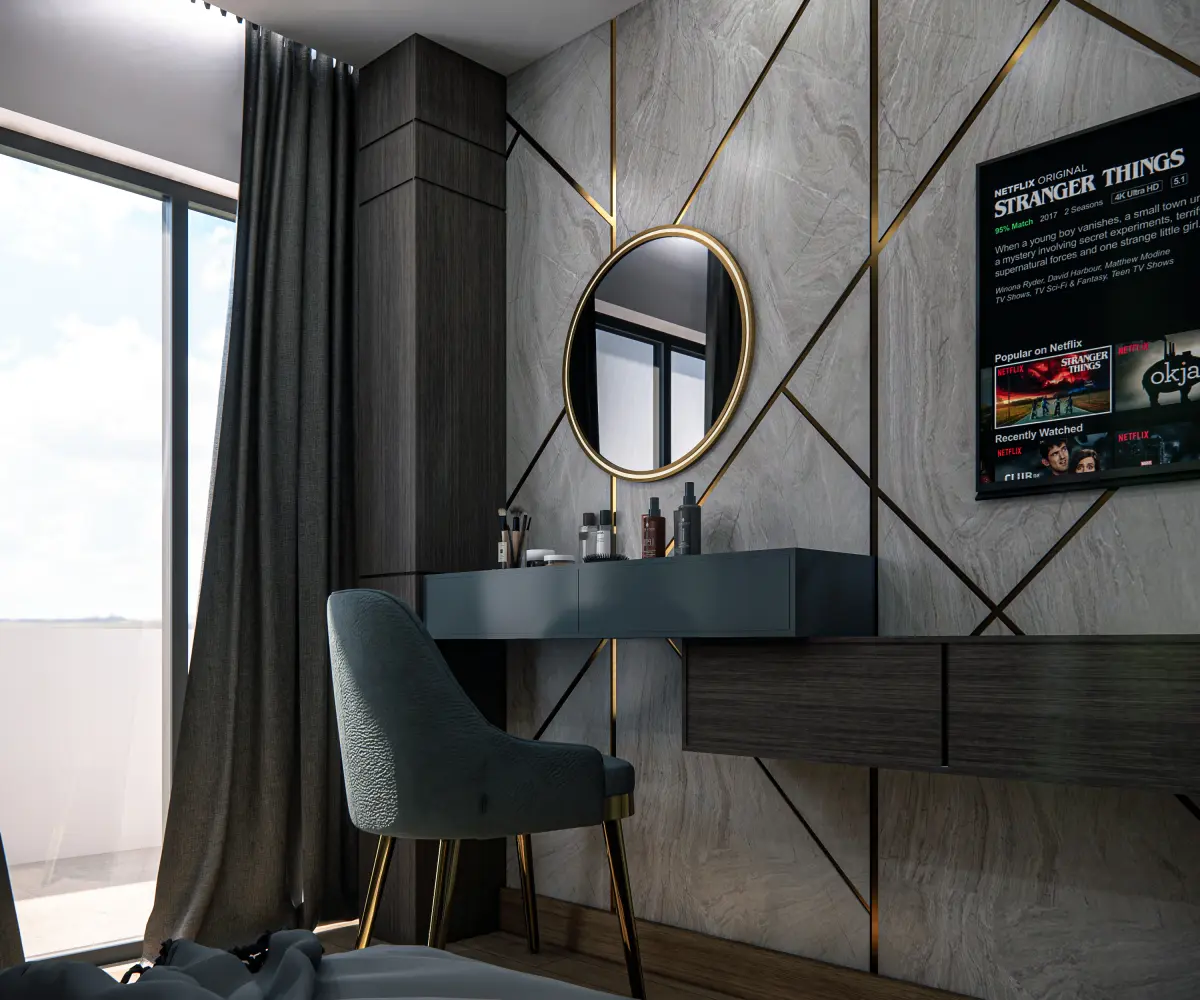 - PU Stone Highlight Panel: A full-height textured polyurethane stone panel inset into the wall adds depth and serves as a focal element behind the bed.