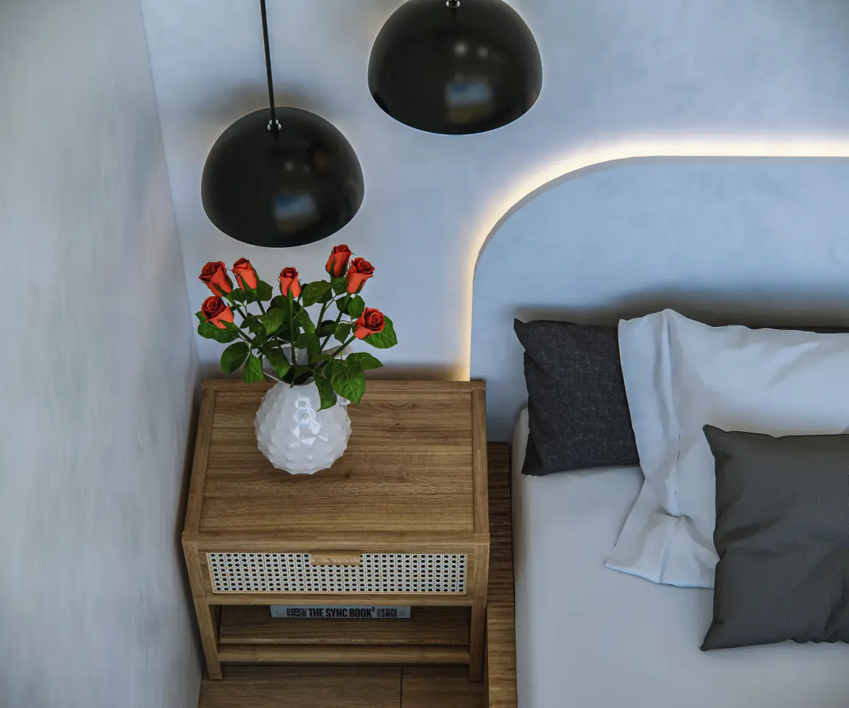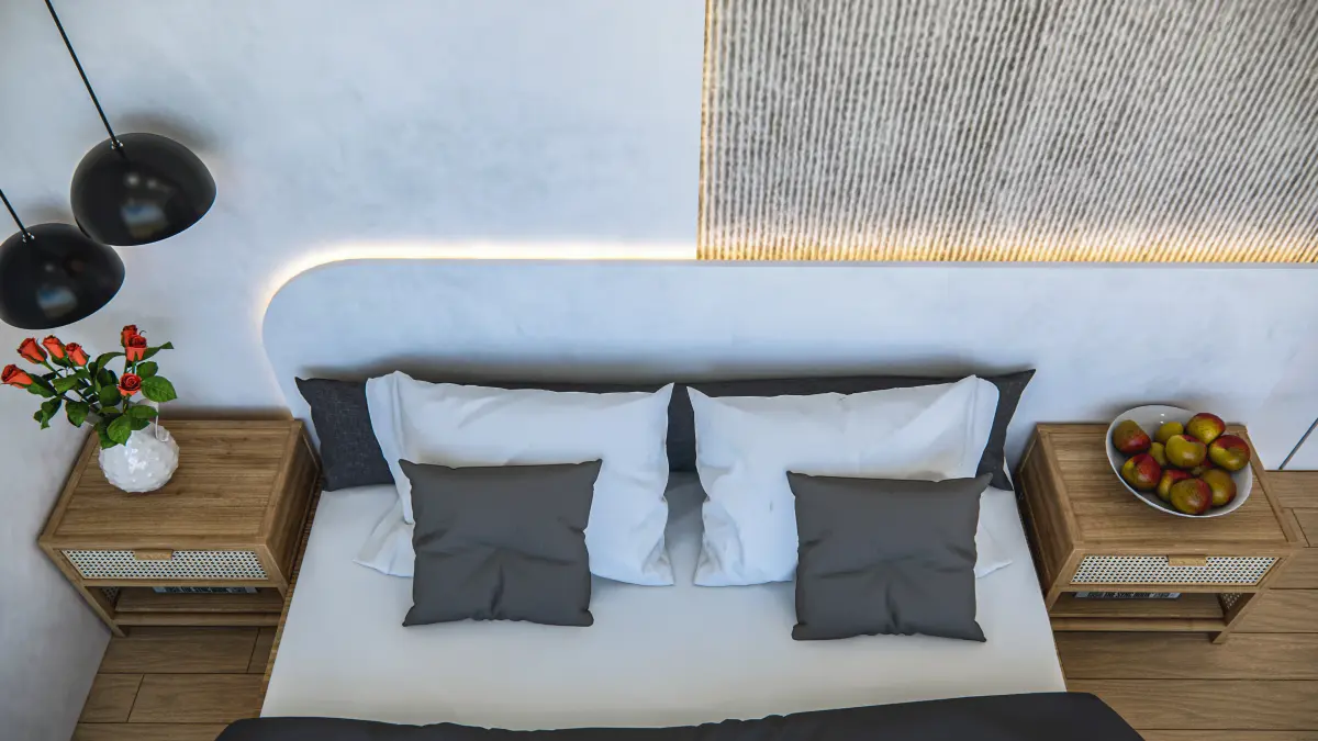 - Modern Side Tables: Sleek, two-drawer nightstands with wood texture and matte drawer fronts complement the overall minimalist theme.