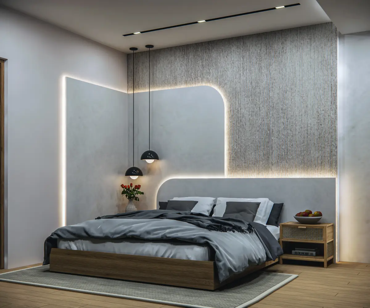 Elevate your interior visualization with this meticulously crafted Modern Minimalist Bedroom 3D model, featuring a clean-lined aesthetic and sophisticated lighting accents. Perfect for architects, designers, and 3D artists, this scene highlights a floating bed design, a striking PU stone feature wall, and minimalist bedside cabinetry—ideal for contemporary residential presentations.