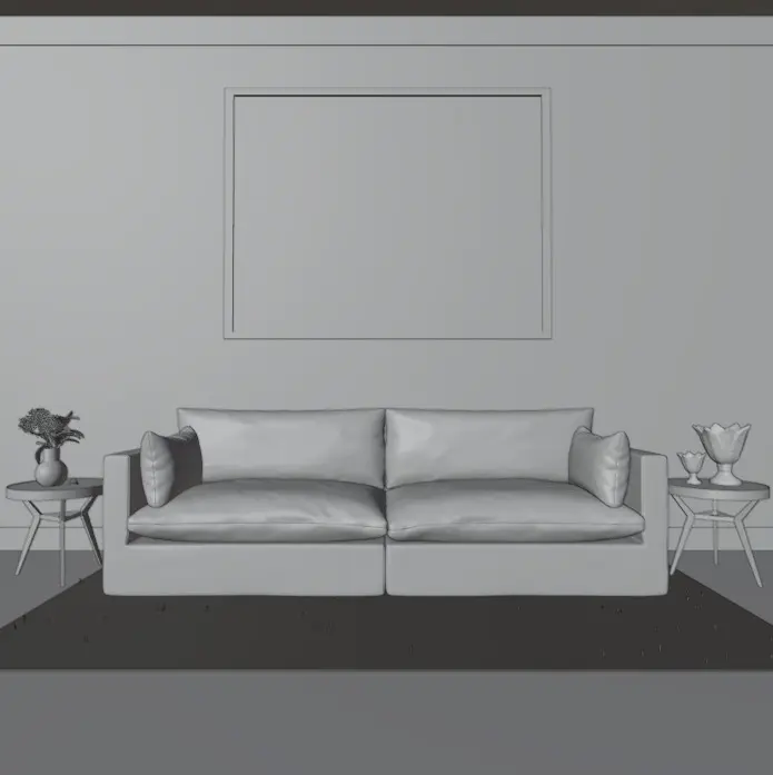This cozy living room design features a soft beige sofa set against a neutral-toned wall with a matching blank art frame. The subtle texture of the cushions complements the elegant white rug with circular patterns. The scene is balanced by two modern side tables adorned with a small vase of flowers and decorative items, bringing a sense of harmony and comfort to the minimalist decor. Ideal for showcasing contemporary interior design with a focus on simplicity and warmth.