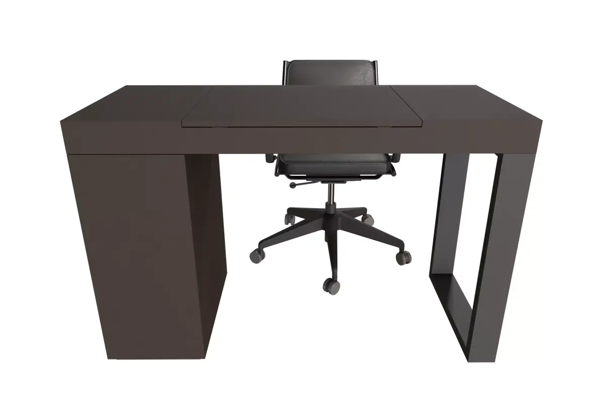 The Desk features a clean, rectilinear design with a dark brown, almost black, finished surface. One side is supported by a solid rectangular panel (potentially containing a hidden compartment), highlighted by a contrasting accent panel in a dark teal or muted blue-green color. The other side is supported by a slender, dark metal frame, emphasizing the minimalist aesthetic.