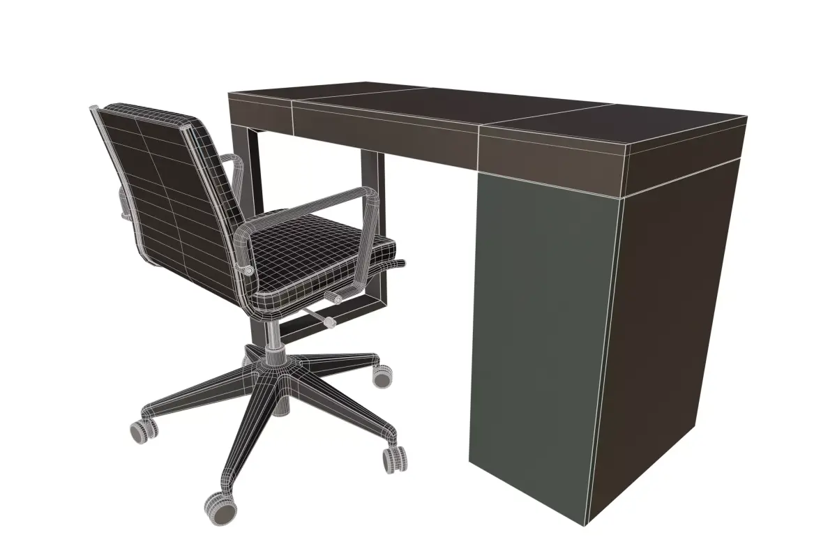 The PBR materials accurately simulate the matte wood finishes, the smooth metal surfaces, and the texture of the chair's upholstery, ensuring realistic light interaction. This optimized set is perfect for furnishing virtual offices, home workspaces, corporate interiors, or high-performance game environments.