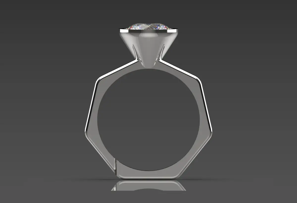 The ring arm has an octagonal shape that adds a unique geometric element to the overall design. This ring is crafted from polished white metal, white gold or silver or platinum, giving it a contemporary and elegant look. The combination of the sparkling diamonds and the distinctive arm design makes this ring eye-catching and sophisticated.
