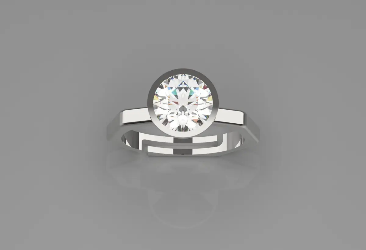 This ring features a modern and stylish design with a prominent round diamond at its center. The diamond is set in a classic bowl shape, allowing maximum light to enter the stone and enhance its brilliance.