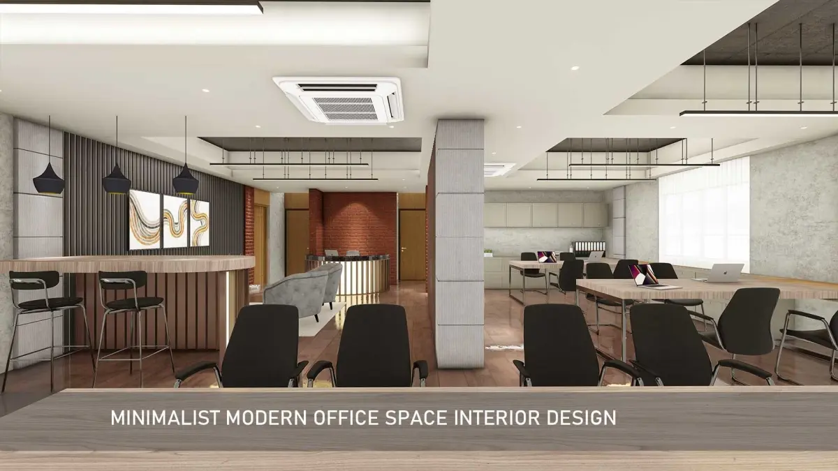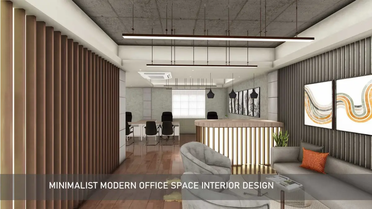 Minimalist modern office space Interior Design design scene with modern furniture, indoor plants and cozy waiting area. The spaces are well lit and air conditioned with minimal design elements. There is provision for ample seating and a small reception area. The walls are adorned with wood panels and abstract artwork.