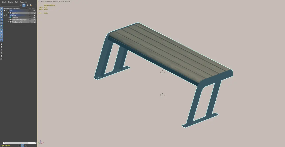 A sleek and modern outdoor bench with a wooden seat and metal frame. Ideal for urban spaces, parks, and contemporary architectural projects.