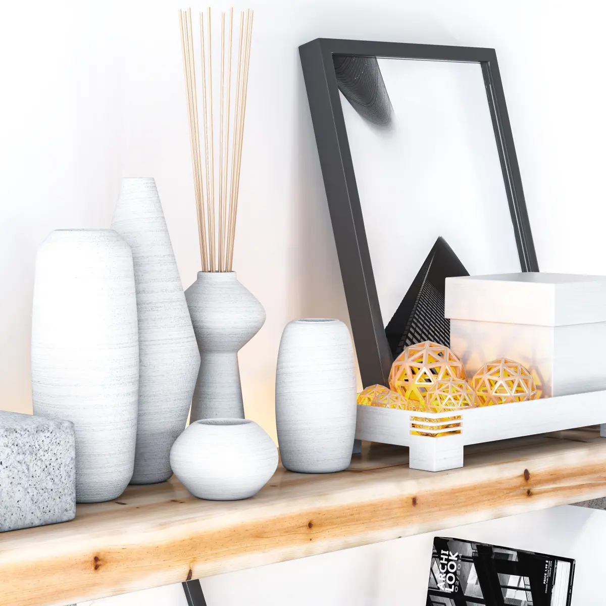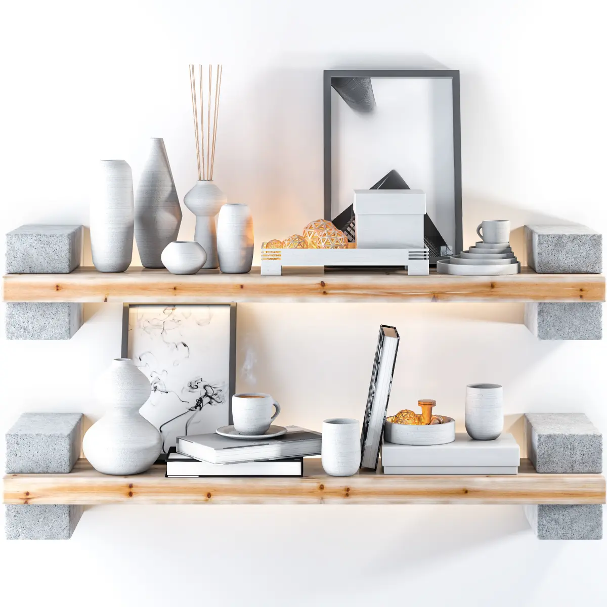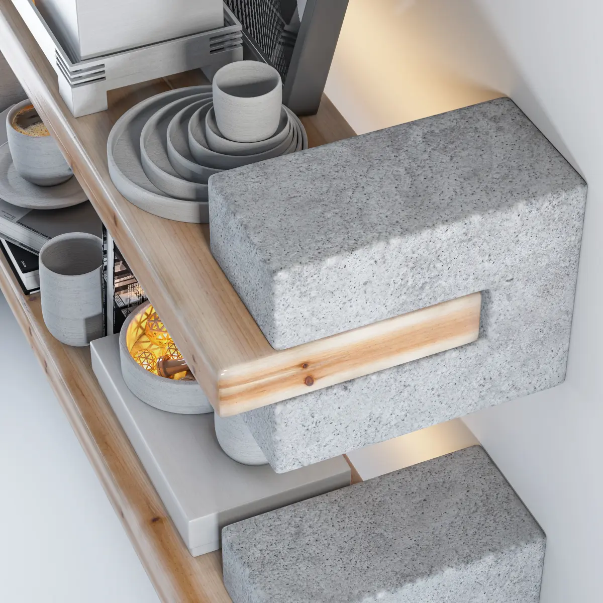 Render Engine: V-RAY, CORONAtwo shelves (wood) and cement leg, two frames, plates, many candles, books, decoration boxes, many caves.