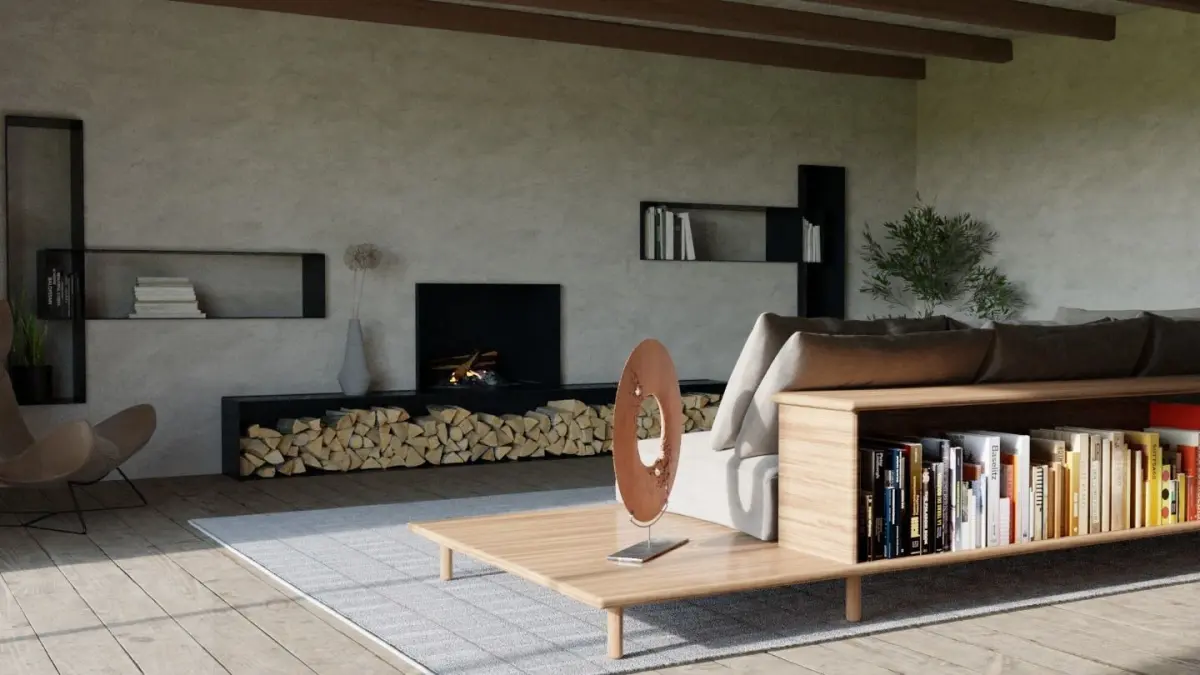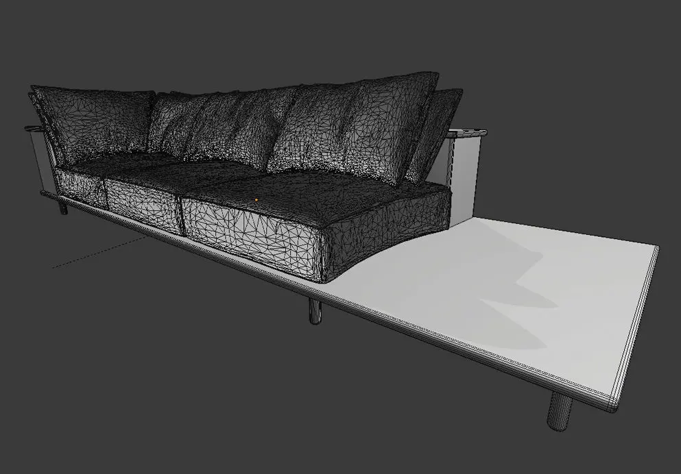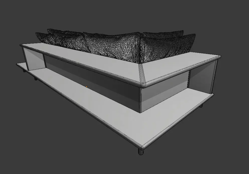 Minimalist contemporary sofa with bookshelf on the back and table on side.Textures are included.