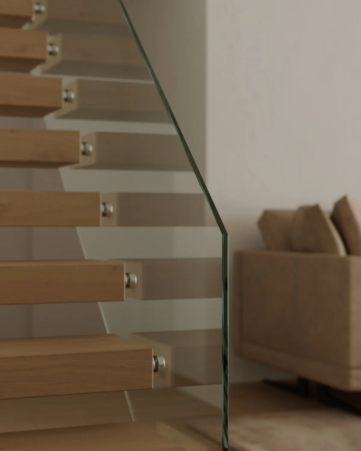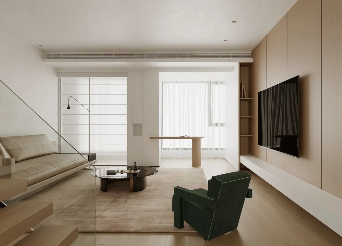A minimalist living room interior with a natural wood tone palette. This scene combines clean lines, light materials, and warm wooden textures to create a calm and elegant atmosphere. Ideal for Scandinavian-inspired or nature-themed design presentations.