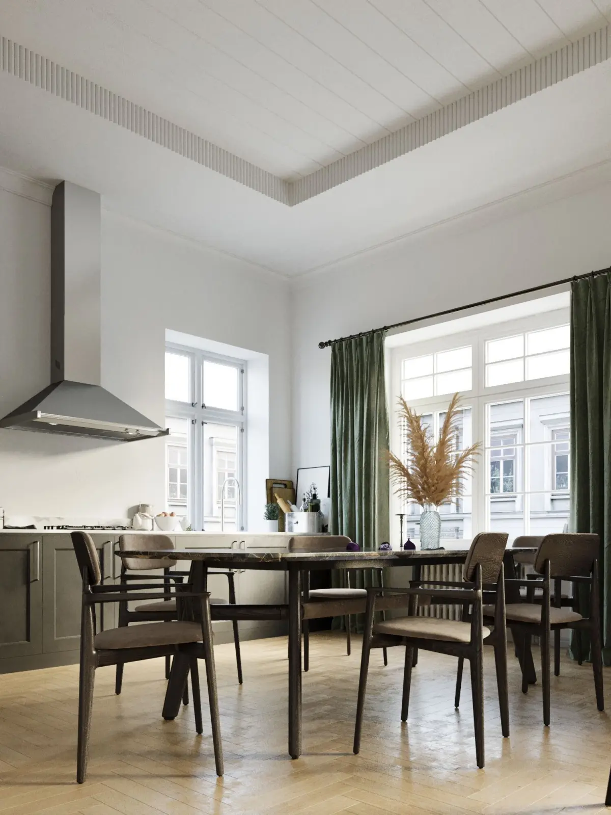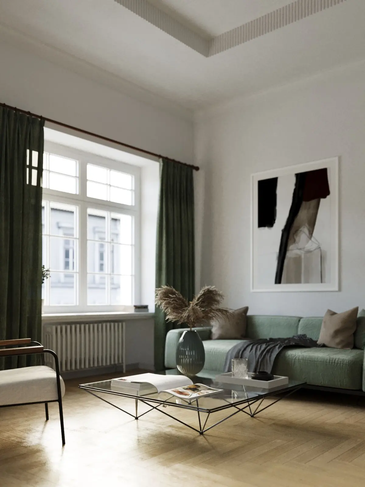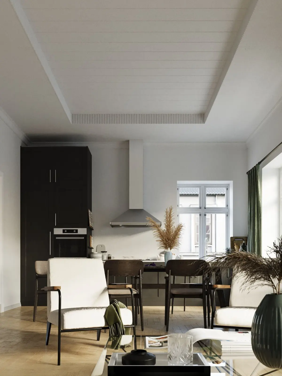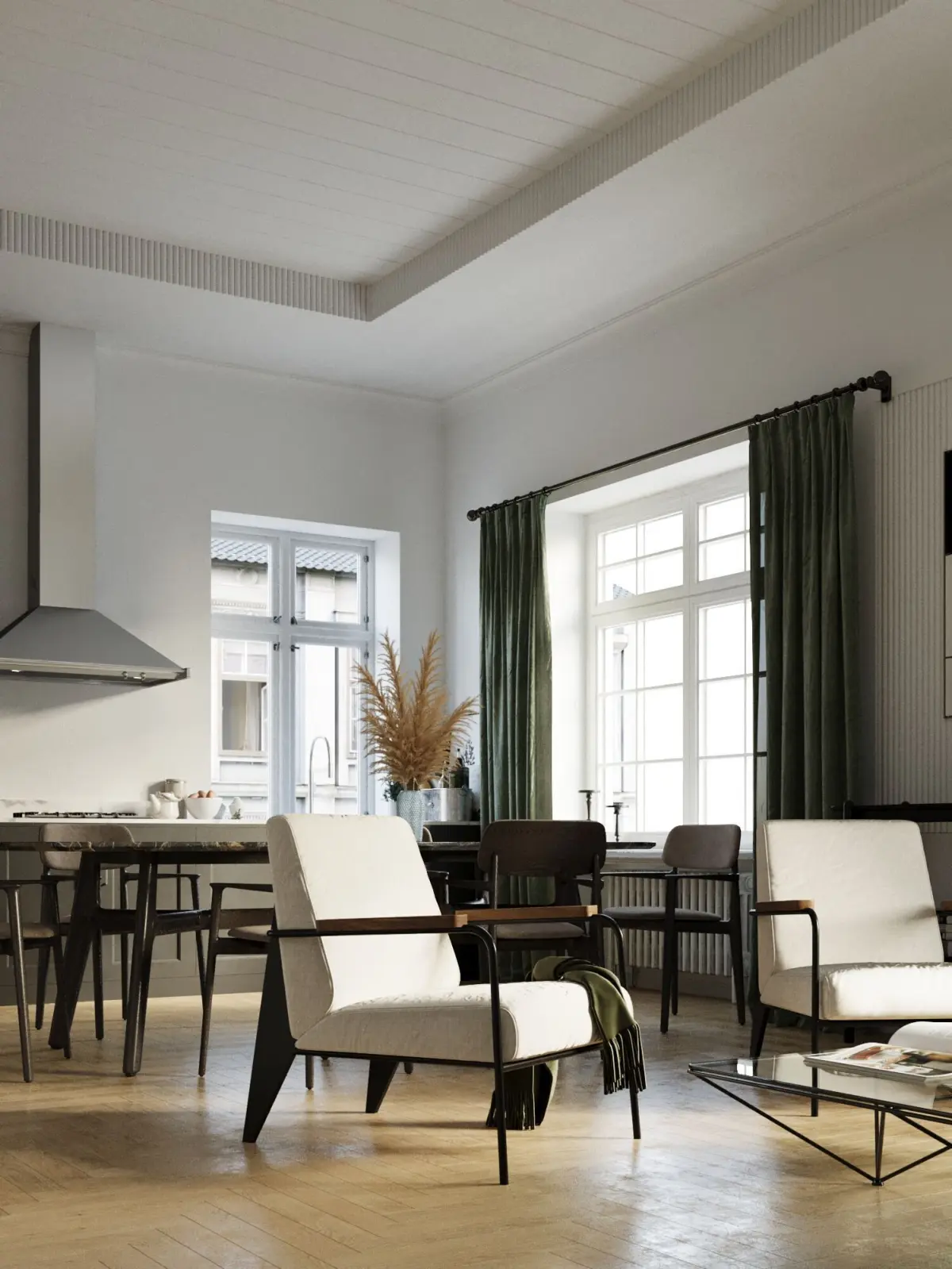 Step into a serene, modern space where clean lines and natural elements create a harmonious balance. The living room and kitchen feature a minimalistic design with a soothing green and white color palette, complemented by warm wood parquet flooring that adds timeless elegance.