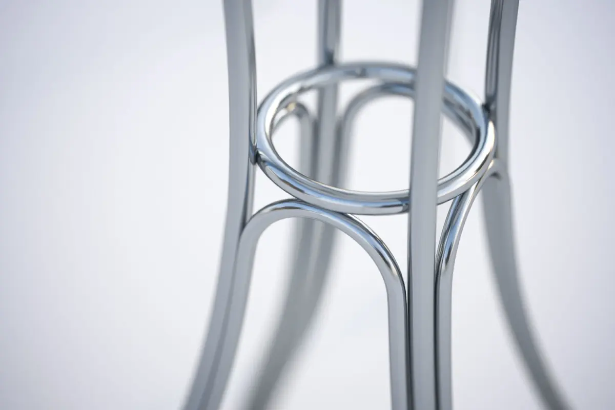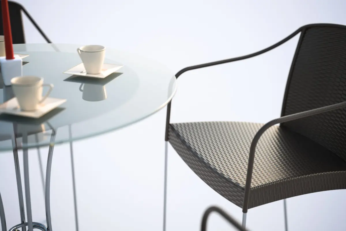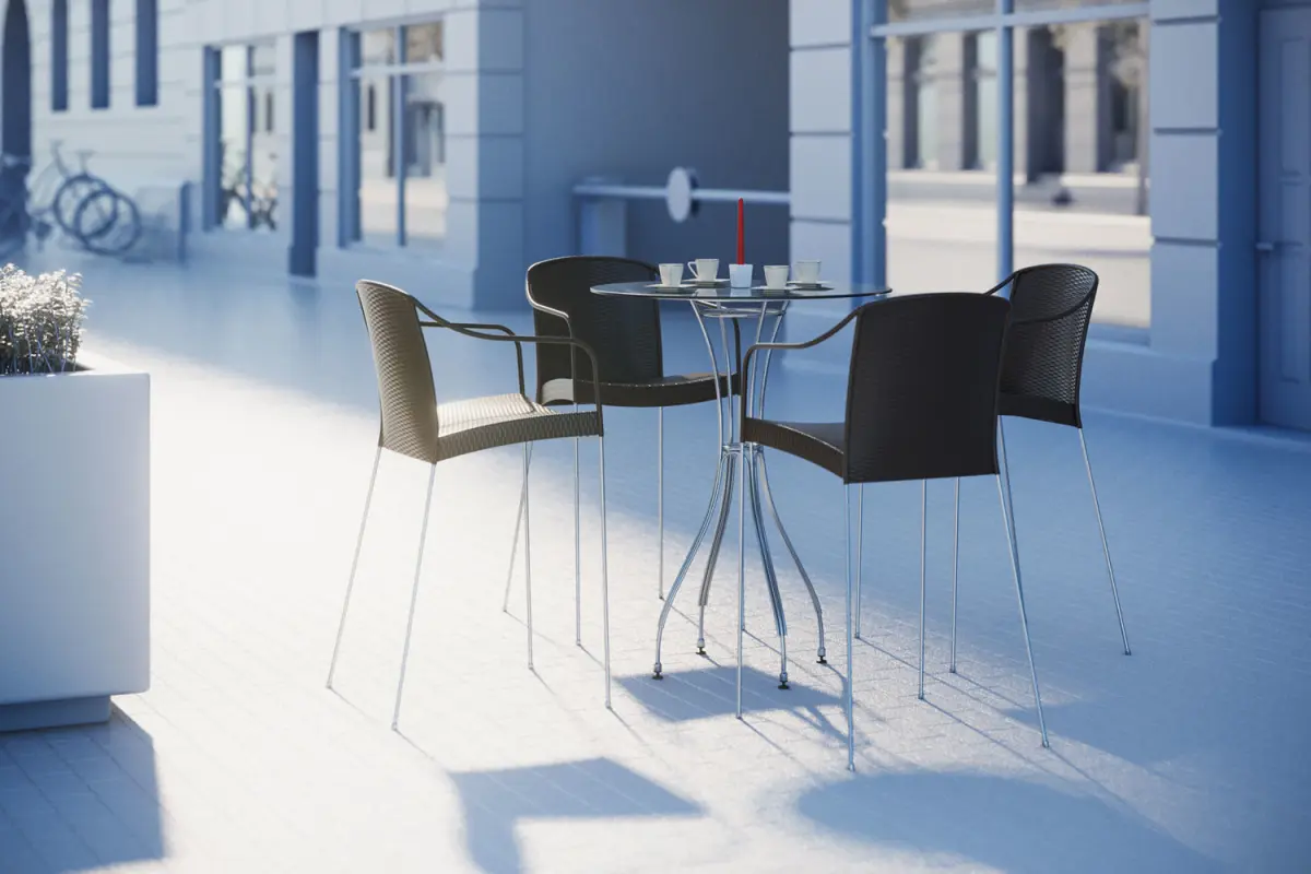 Simple set of four minimalist chairs arranged in front of the building. A coffee set was placed on the table.Model prepared for 3d architectural visualisations and other graphic works.