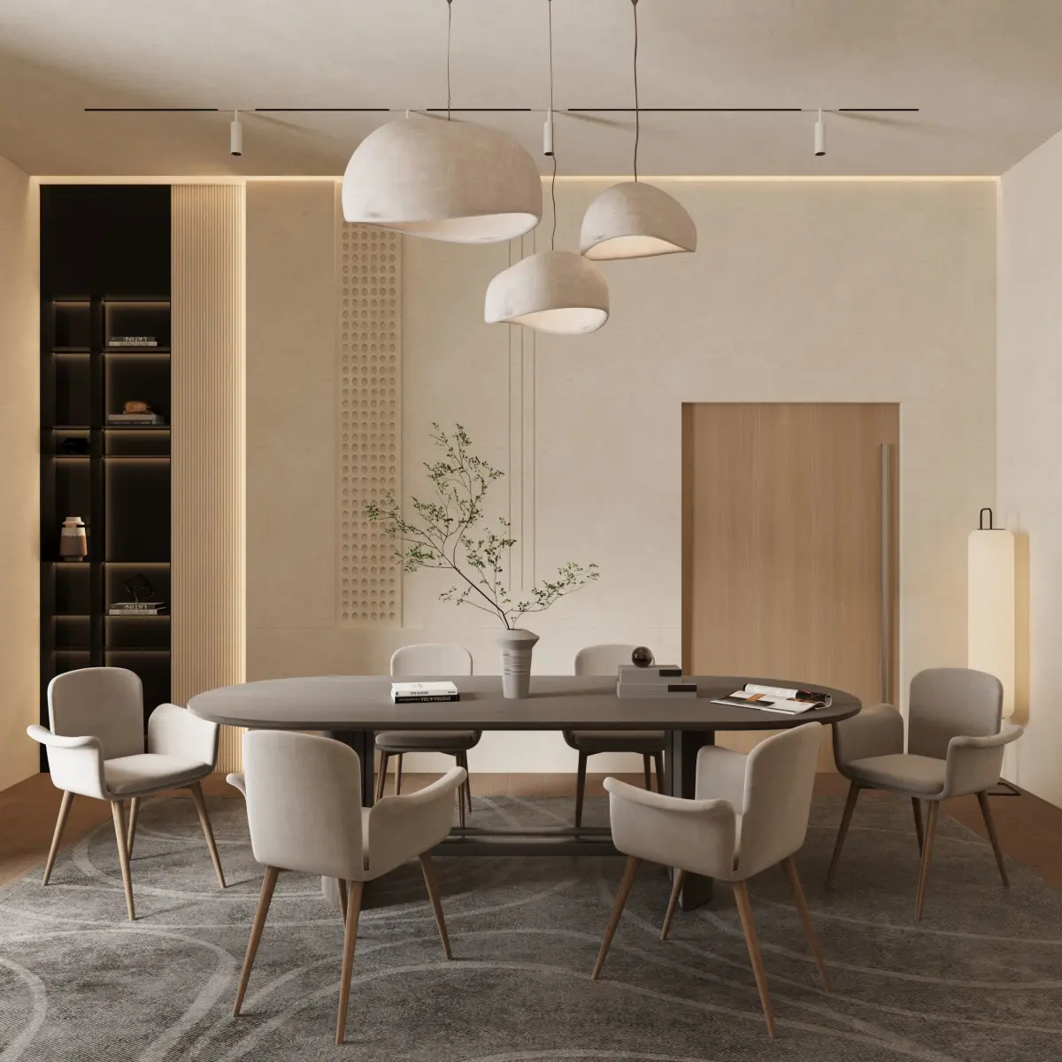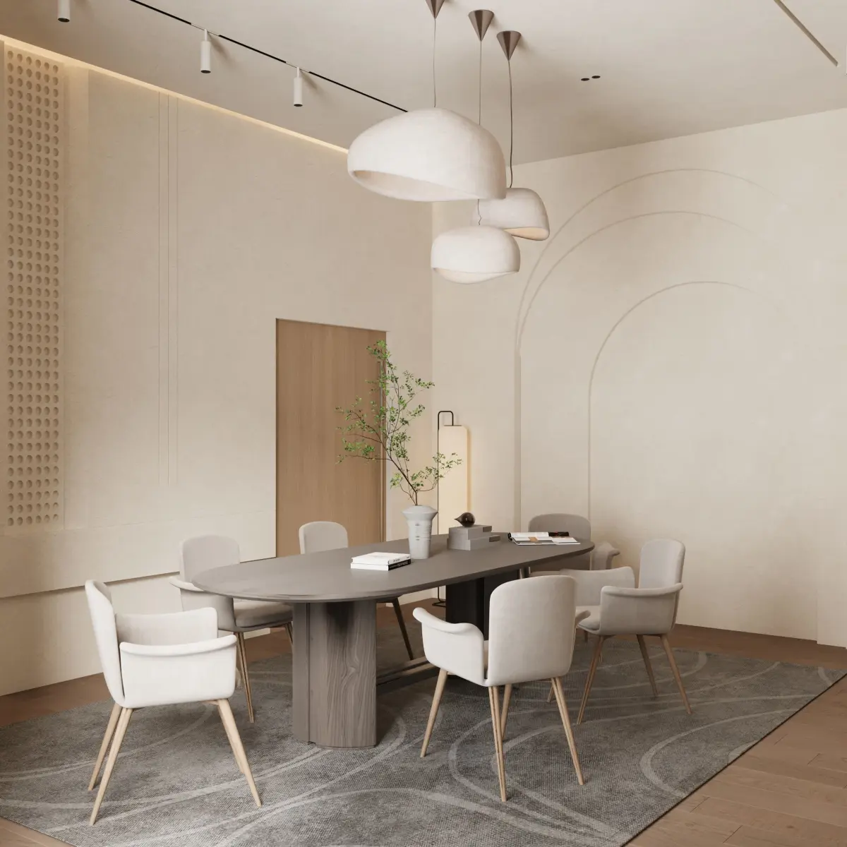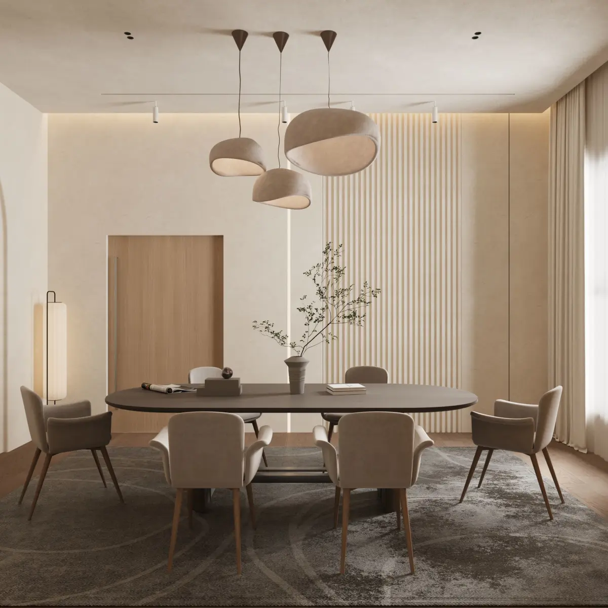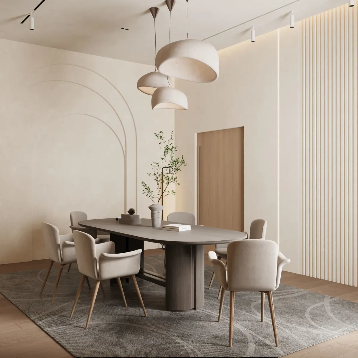 Minimalist dining room design, modern dining space, sleek dining room decor, contemporary dining room, neutral tones dining area, simple dining room design, luxury dining room, minimalistic interior design, modern home decor, stylish dining space, dining room ideas.