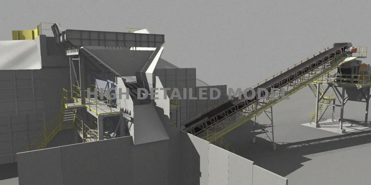 Mining plant with conveyor, shutts, magnetic extractor and sieves, for presentations, animations.