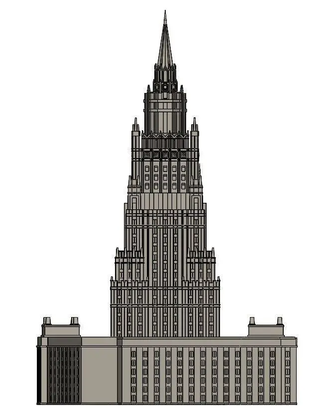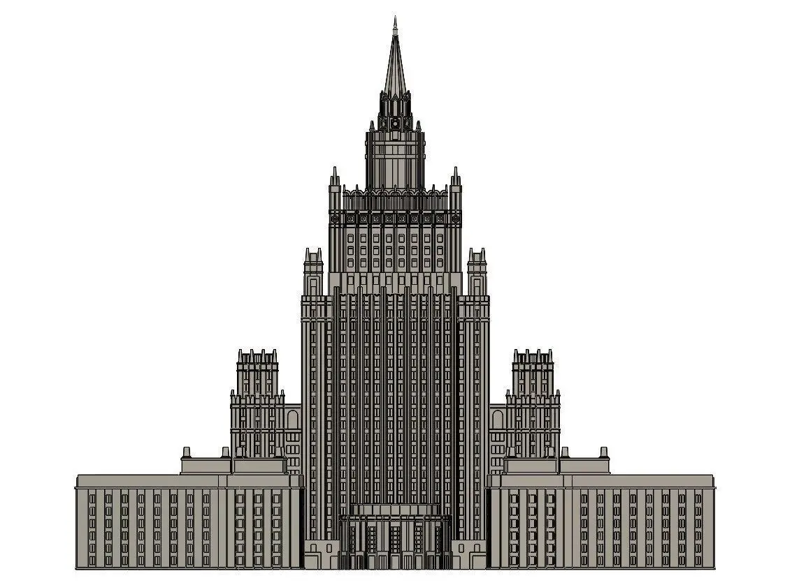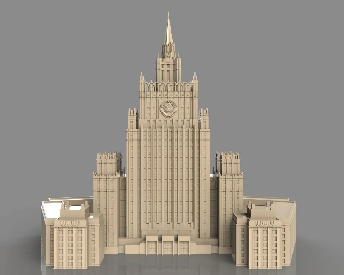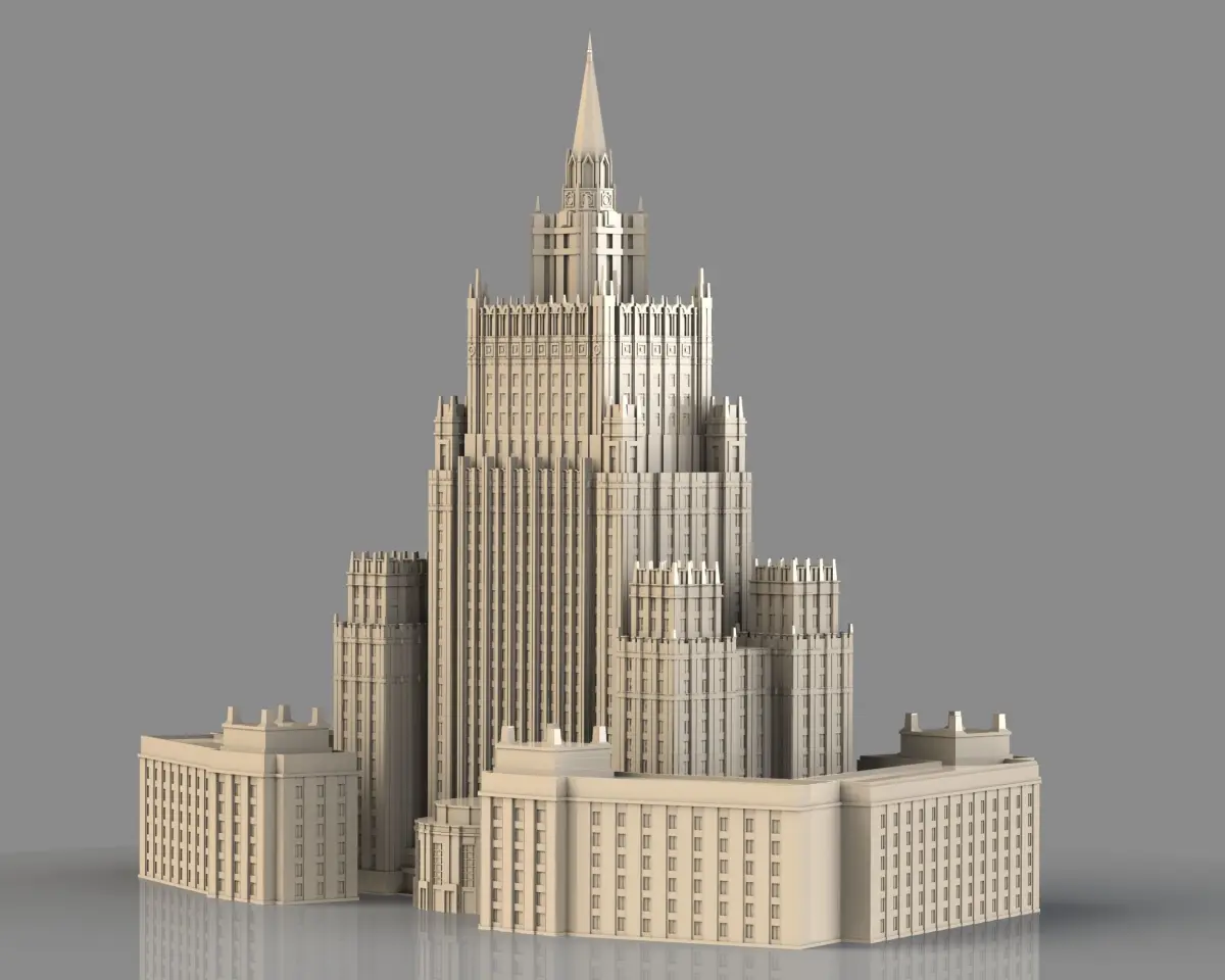 Здание Министерства иностранных дел России, город Москва. Одна из московских высоток. Твердотельная модель габаритами 4765 х 2719 мм, высотой 4130 мм в форматах sldprt, stp, igs, stl