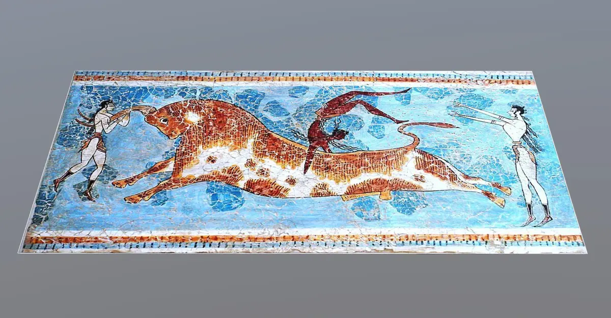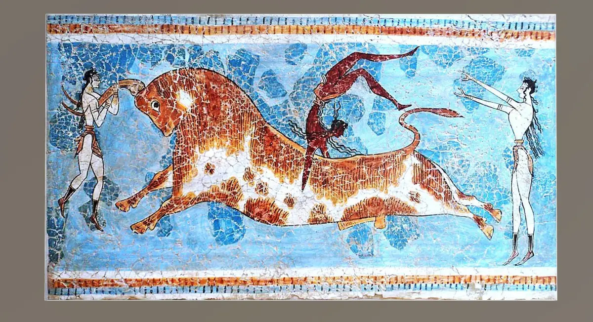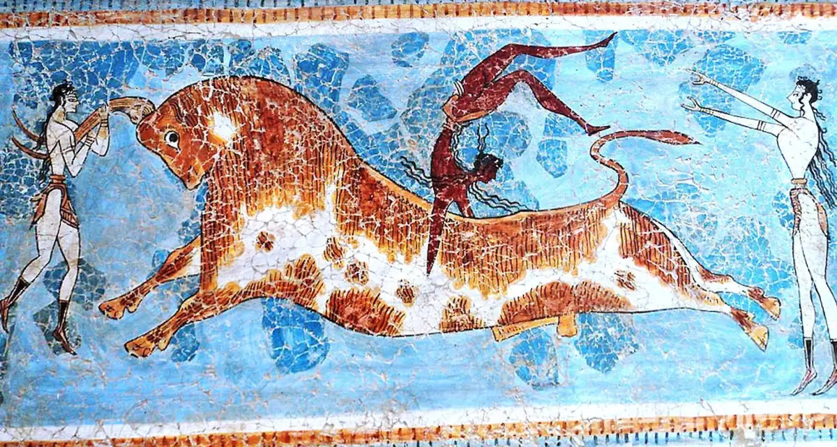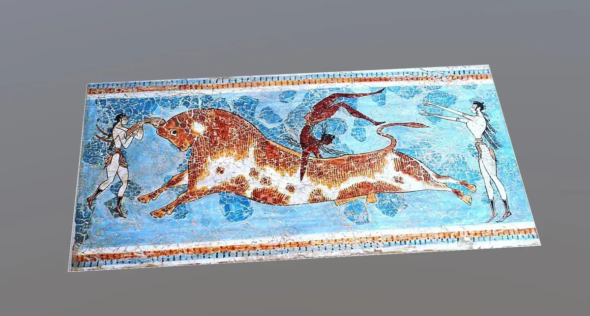 It is a figurative painting of a naturalistic nature. In the scene, a bull appears as the main figure, in an attitude of charging, then three characters appear, two women, one holding the bull by the horns, and another behind the bull with outstretched arms, seeming to wait to pick up the third character. a man describing a pirouette above the bull. The man wears the typical skirt and has long hair, the women dress in typical costumes and have bare chests, as seems customary in Crete. It seems to be a playful game or a ceremony or rite linked to religion. The technique used is fresco.