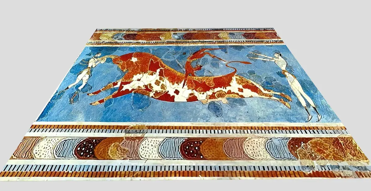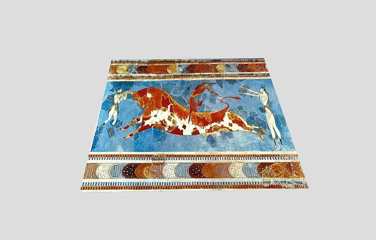 It is a figurative painting of a naturalistic nature. In the scene, a bull appears as the main figure, in an attitude of charging, then three characters appear, two women, one holding the bull by the horns, and another behind the bull with outstretched arms, seeming to wait to pick up the third character. a man describing a pirouette above the bull. The man wears the typical skirt and has long hair, the women dress in typical costumes and have bare chests, as seems customary in Crete. It seems to be a playful game or a ceremony or rite linked to religion. The technique used is fresco.